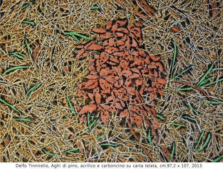 Maggiore spazio sarà riservato ai lavori più recenti, nei quali l’interesse di Delfo Tinnirello si è concentrato sul “terzo paesaggio”: frammenti di natura trascurati e calpestati, che diventano portavoce della forza dirompente della natura stessa che riesce a vincere sulla disattenzione, sul disinteresse, sulla frenesia; una natura fatta di elementi semplici, chiamati a essere testimoni di bellezza assoluta dallo sguardo attento dell’artista: quasi una “lente di ingrandimento” pronta a valorizzare e a mostrare la grandezza di un filo d’erba, di un ago di pino, di una foglia morta.