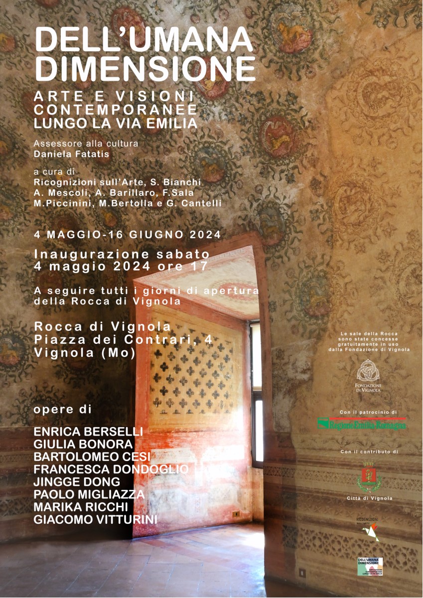 Sabato 4 maggio 2024, alle ore 17.00, presso la Sala dei Contrari della Rocca di Vignola, in provincia di Modena, sarà inaugurata la mostra collettiva “Dell’umana dimensione. Arte e Visioni contemporanee lungo la Via Emilia” con opere di Enrica Berselli, Giulia Bonora, Bartolomeo Cesi, Jingge Dong, Francesca Dondoglio, Paolo Migliazza, Marika Ricchi e Giacomo Vitturini. La sala dei Contrari e le sale della Rocca di Vignola, dove è allestita l’esposizione, sono state concesse gratuitamente in uso dalla Fondazione di Vignola.