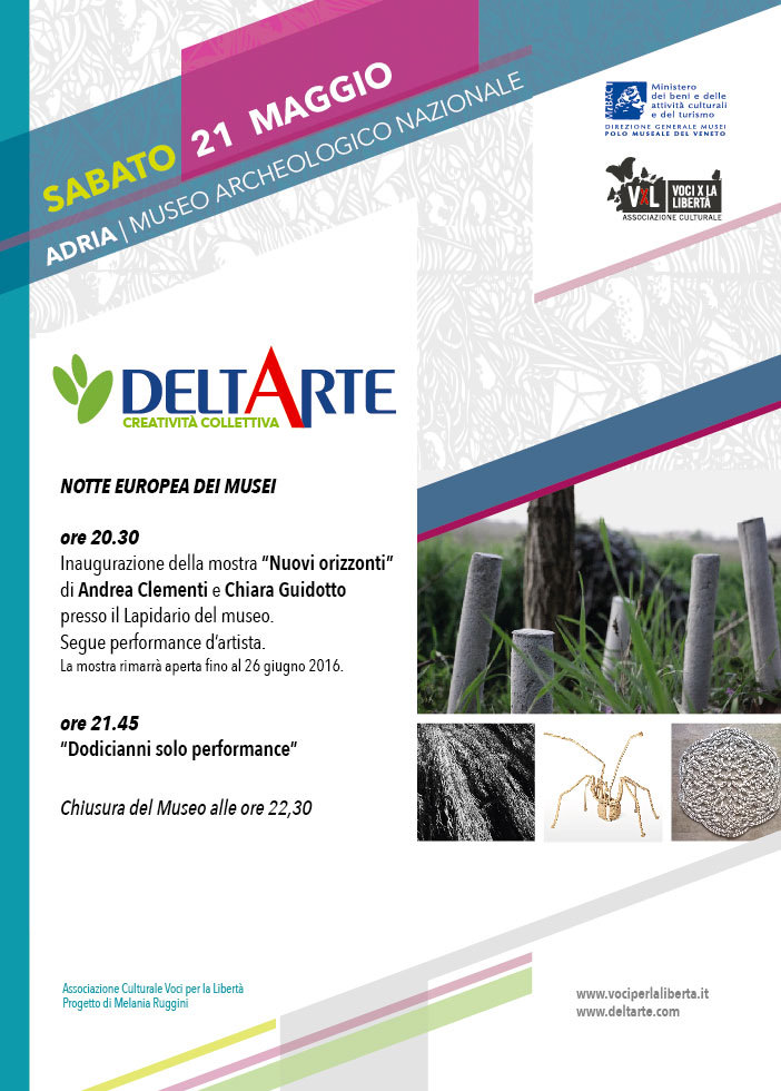 Per la Notte Europea dei Musei il festival itinerante DeltArte, capeggiato dall’Associazione Voci per la Libertà, presenta il quarto appuntamento presso il Lapidario del Museo Archeologico Nazionale di Adria, dove si potrà visitare “Nuovi Orizzonti” la mostra di Chiara Guidotto e Andrea Clementi.