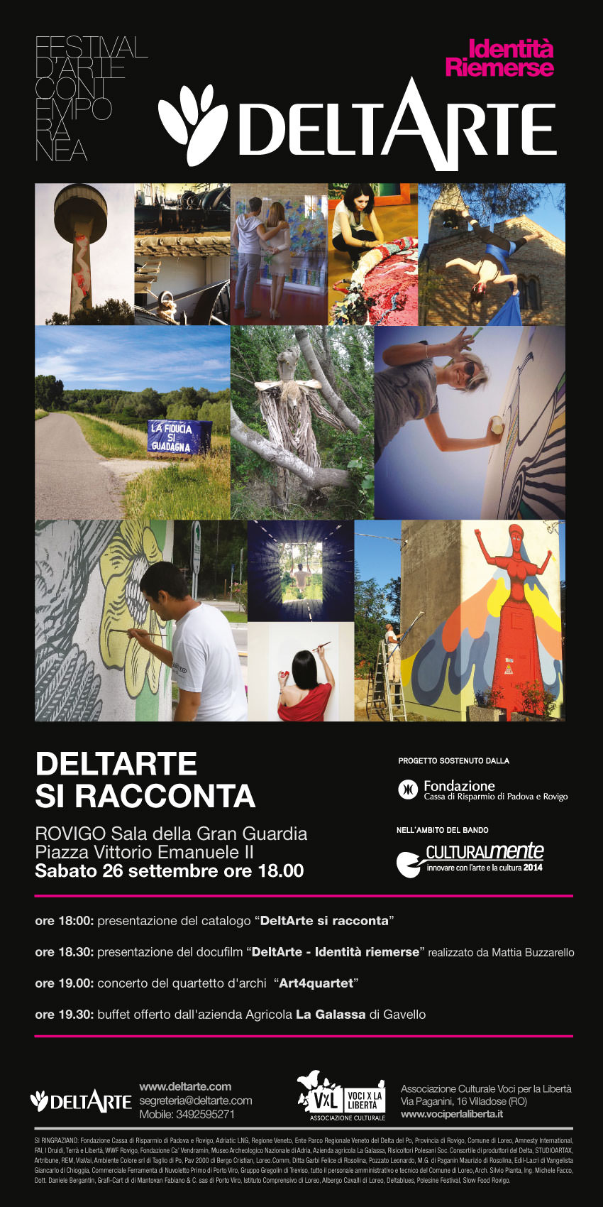 “Per l’Associazione Culturale Voci per la Libertà – afferma il direttore artistico Michele Lionello - questi due anni di gestione di Deltarte sono stati sicuramente una crescita e un arricchimento del nostro bagaglio organizzativo, artistico e culturale. Per noi che da quasi vent’anni ci occupiamo di musica e diritti umani DeltArte è stata una sfida. Un progetto estremamente articolato che coinvolge un numero elevato di location e giovani artisti nel campo dell’arte contemporanea. Una sfida che abbiamo vinto: il Delta del Po è stato invaso dalla creatività under 35, riuscendo a creare un festival itinerante unico nel nostro territorio. Programmi come questo andrebbero costantemente sostenuti per riuscire a dare una continuità progettuale che è quello che spesso manca e che non consente di poter crescere e realizzare una vera e propria rete territoriale.”