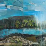 Attese, spostamenti e richiami intitolano le opere; la serie dei “Laghi di carta” e alcune opere su tela ci accolgono in galleria, per culminare nel dittico “Verso la caduta del cielo”. Al piano sotterraneo, grandi opere su carta si alternano a lavori su legno di recupero e alla tela “Acqua che vuoi diventare”, tra movimenti fluidi e cromatismi rarefatti. La pittura e il collage ricoprono la superficie di quasi tutte le opere, originando interessanti contrasti materici.