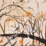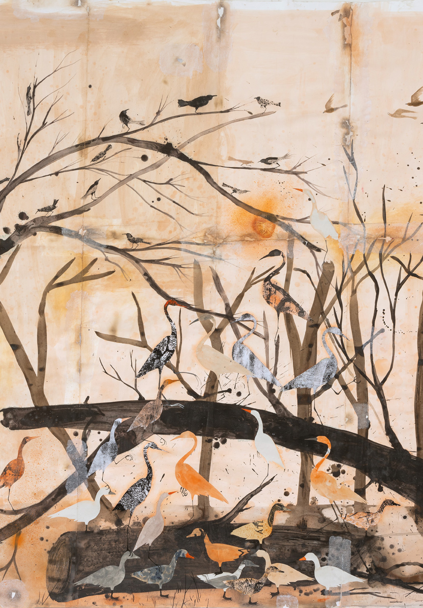 Sulla superficie della carta avviene una combinazione alchemica tra liquidi e fuochi, tra acqua e polvere, una specie di ossimoro o contrasto o battaglia, o gioco anche, un esperimento che si amalgama restituendoci infine una visione sfuocata delle cose. Come miraggio. Come immagine mossa dalle onde del calore. Come acqua incanalata selvaggia in un giardino foresta, arso o fangoso, o spazzato dal vento e dalla tempesta. Foglie e rami. Pozzanghere. Temporali in lontananza. Crepe e spaccature nella terra. Boschi aridi e secchi. Dighe di castoro. Devastazioni. Paradisi perduti. Riserve indiane. Sabbia e uccellini. Nidi giganti come astronavi. Traiettorie labirintiche di disegno impazzito. Bave di lumaca. Leggerezze, giochi e gentilezze gratuite per riposare dalle fatiche.