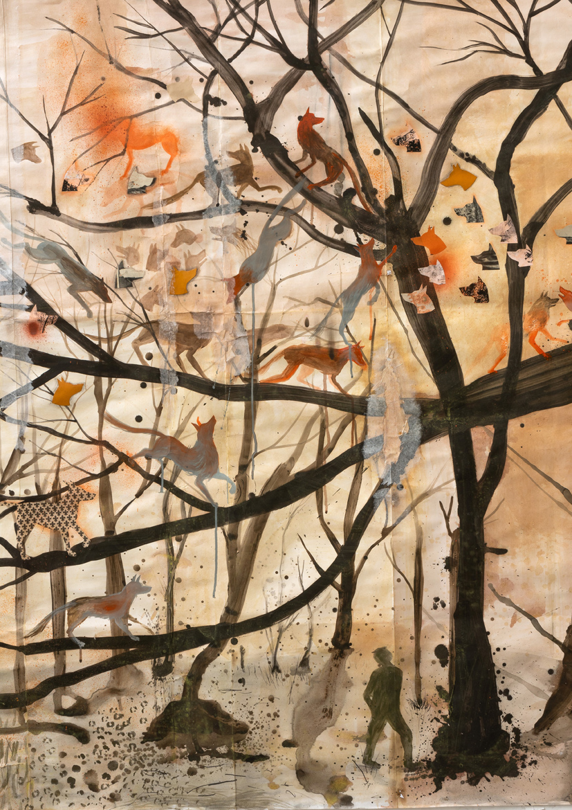 A questi disegni in forma di paesaggio frammentato e continuo, che assomigliano a una coltivazione lenta che si espande nel tempo, come un diario di cose viste immaginate sognate che si susseguono senza sosta, mutanti e in movimento, si affiancano cinque grandi carte che esplorano anch’esse le stratificazioni geologiche del tempo, attraverso visioni naturali in cui gli attori, che attraversano inconsapevolmente questi paesaggi, si soffermano un momento, in una specie di incanto o inceppatura della migrazione senza fine a cui sono sottoposti o spinti, per tensione interna o costrizione. Perché bestie e uomini sono qui, quasi sempre, ombre, silhouette o fantasmi. Non si accorgono di noi che li guardiamo, e loro non ci guardano. Intenti nelle loro azioni inspiegabili e bambine, galleggianti e lunari. Mentre attraversano il deserto infuocato. Non so se ribelli, poetici assai. Sempre. E misteriosi. Come visti in un teatro. O in un diorama a grandezza soldatino.