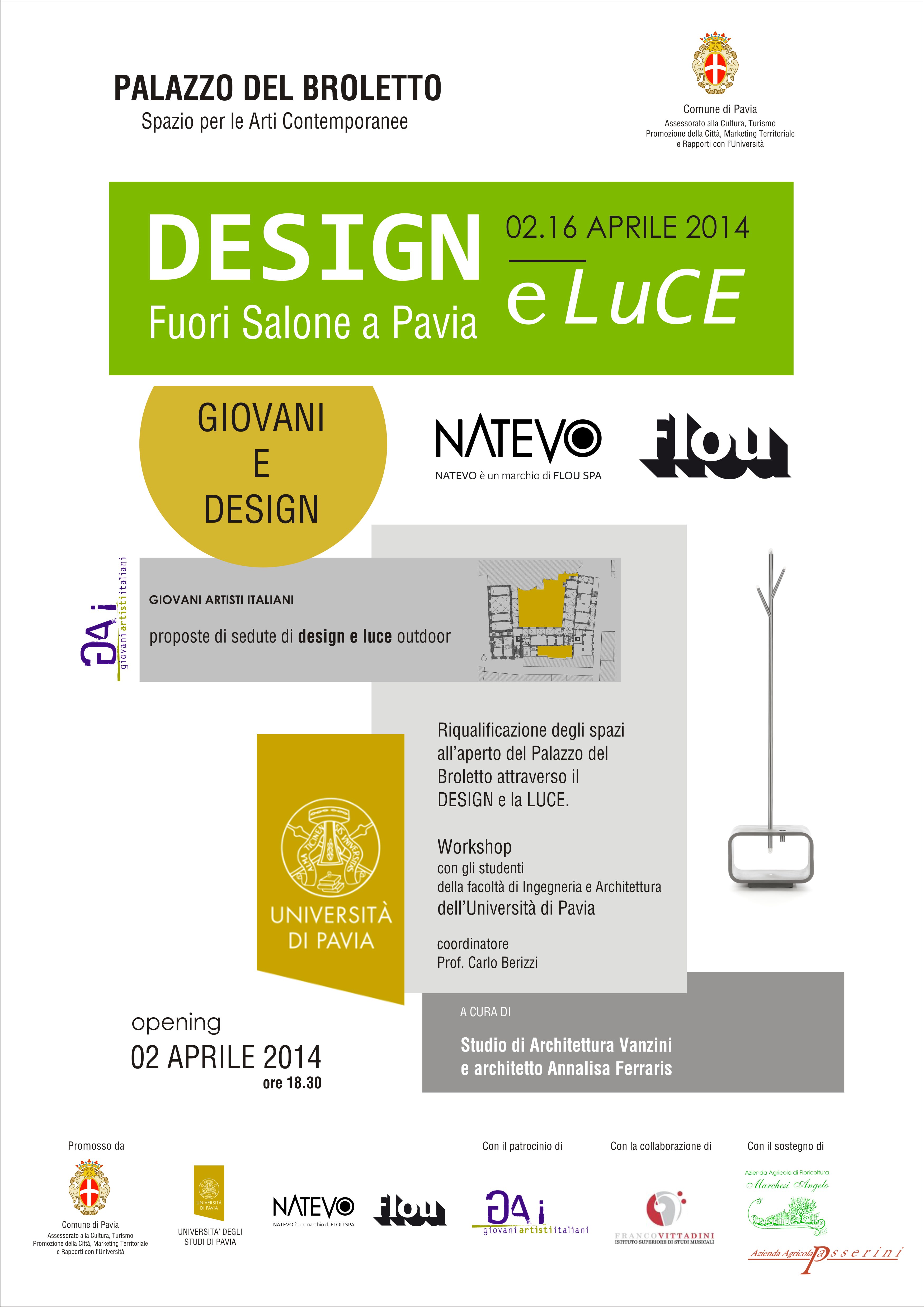 Esposte in anteprima, fino al 16 aprile 2014, sono le installazioni luminose di NatevoLab /Flou, azienda leader nel settore del design e arredamento, aperta alla ricerca e alla valorizzazione dei giovani, che promuove nello specifico un progetto di ripensamento architettonico e di “sedute con luce outdoor”, elaborate per i cortili (maggiore e minore) del Broletto dai designer e dagli studenti coinvolti. Insieme alle installazioni saranno presentati al pubblico i progetti e le proposte di idee di alcuni giovani designer e di studenti dell’Università degli Studi di Pavia.