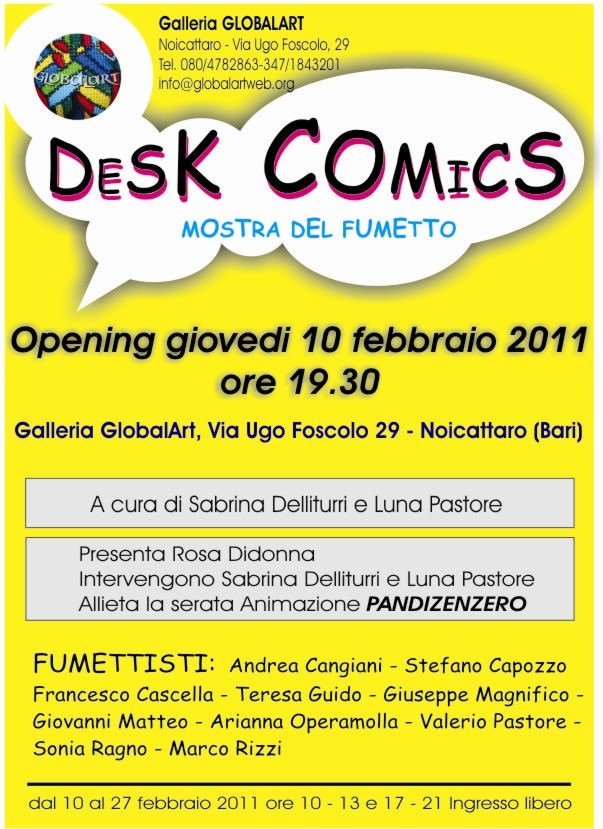 Si inaugura giovedì 10 febbraio 2011 alle ore 19.30 la mostra presso la Galleria GlobalArt diretta da Rosa Didonna a Noicattaro (Bari). "Desk ComicS", una collettiva tutta dedicata all’Arte del Fumetto.