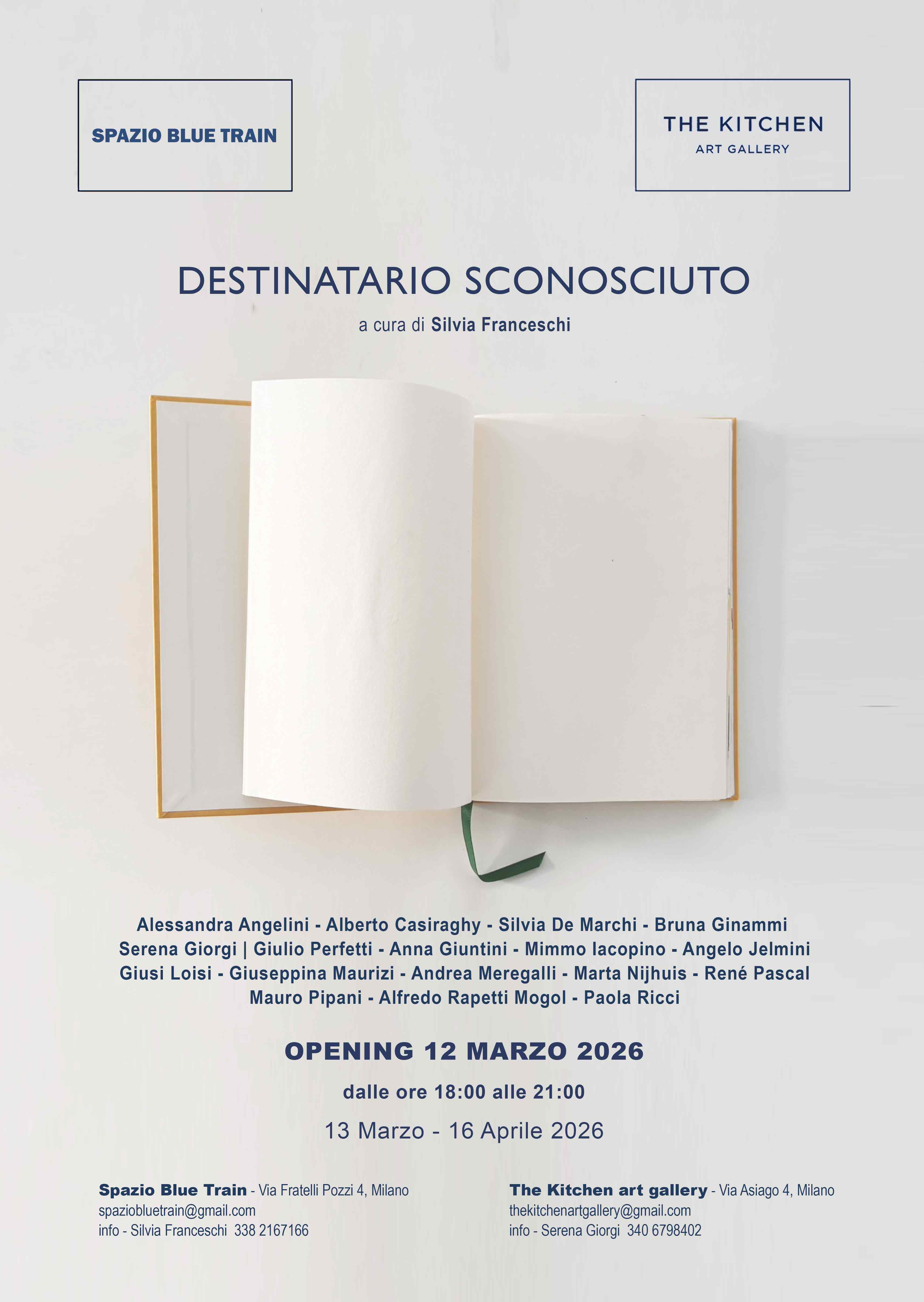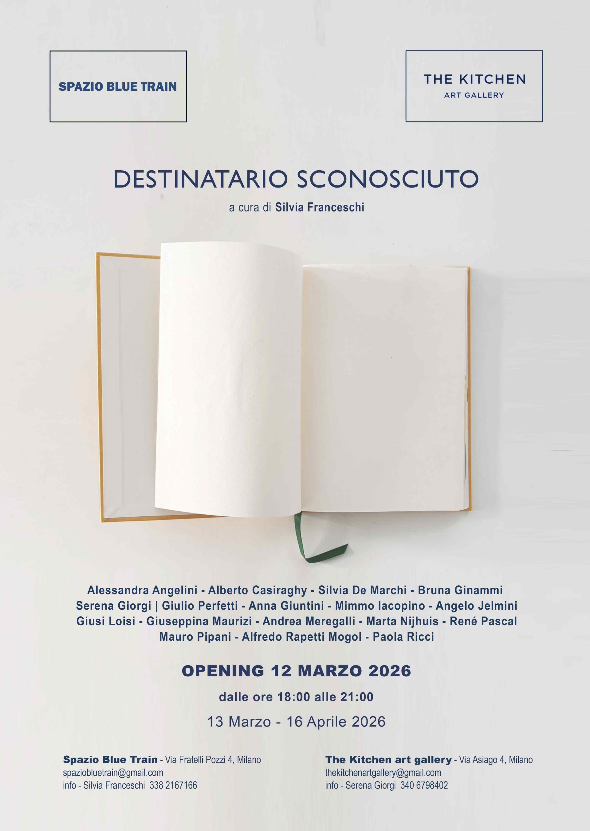 Milano, marzo 2026 – Spazio Blue Train e The Kitchen art gallery, due spazi di Milano in zona Gorla - Naviglio Martesana, presentano dal 13 marzo al 16 aprile 2026 nella loro consueta modalità ‘una mostra, due spazi’ Destinatario sconosciuto, mostra collettiva, a cura di Silvia Franceschi, incentrata sul libro d’artista, al quale tuttavia ogni partecipante accosta anche lavori di altro tipo.