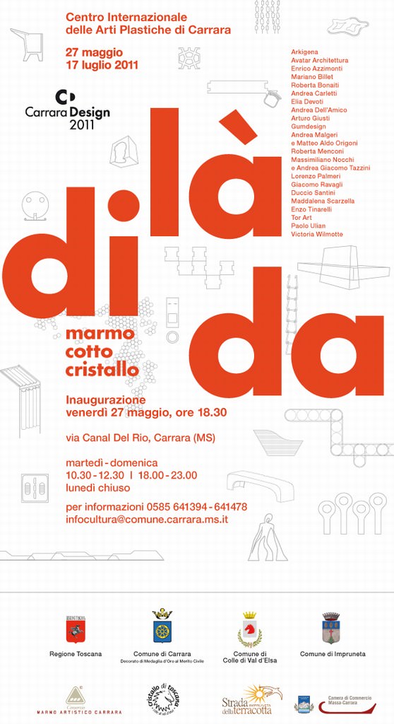 Sarà inaugurata venerdì 27 maggio, alle ore 18.30, presso il centro Internazionale delle Arti Plastiche di Carrara, "DI LA' DA", mostra dedicata al design, a cura di Aldo Colonetti, direttore scientifico dell'Istituto Europeo di Design ,progetto exibit design di Franco Origoni e Anna Steiner, L'evento è organizzato dal Comune di Carrara, con il contributo di Regione Toscana, Comune di Colle Val D'elsa, Comune d'Impruneta, Consorzio Artistico del Marmo di Carrara, Consorzio del Cristallo di Toscana di Colle Val D'Elsa Consorzio della Terracotta dell'Impruneta, Camera di Commercio di Massa Carrara, Fondazione Cassa di Risparmio di Carrara.