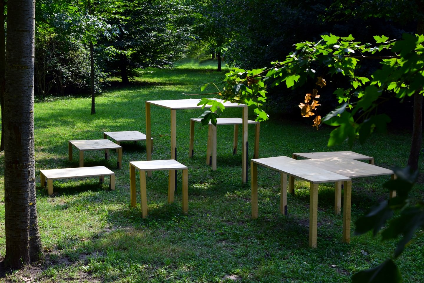 Nella performance ogni sedia /tavolo dell’installazione TAVOLO CON TAVOLO assume la forma di