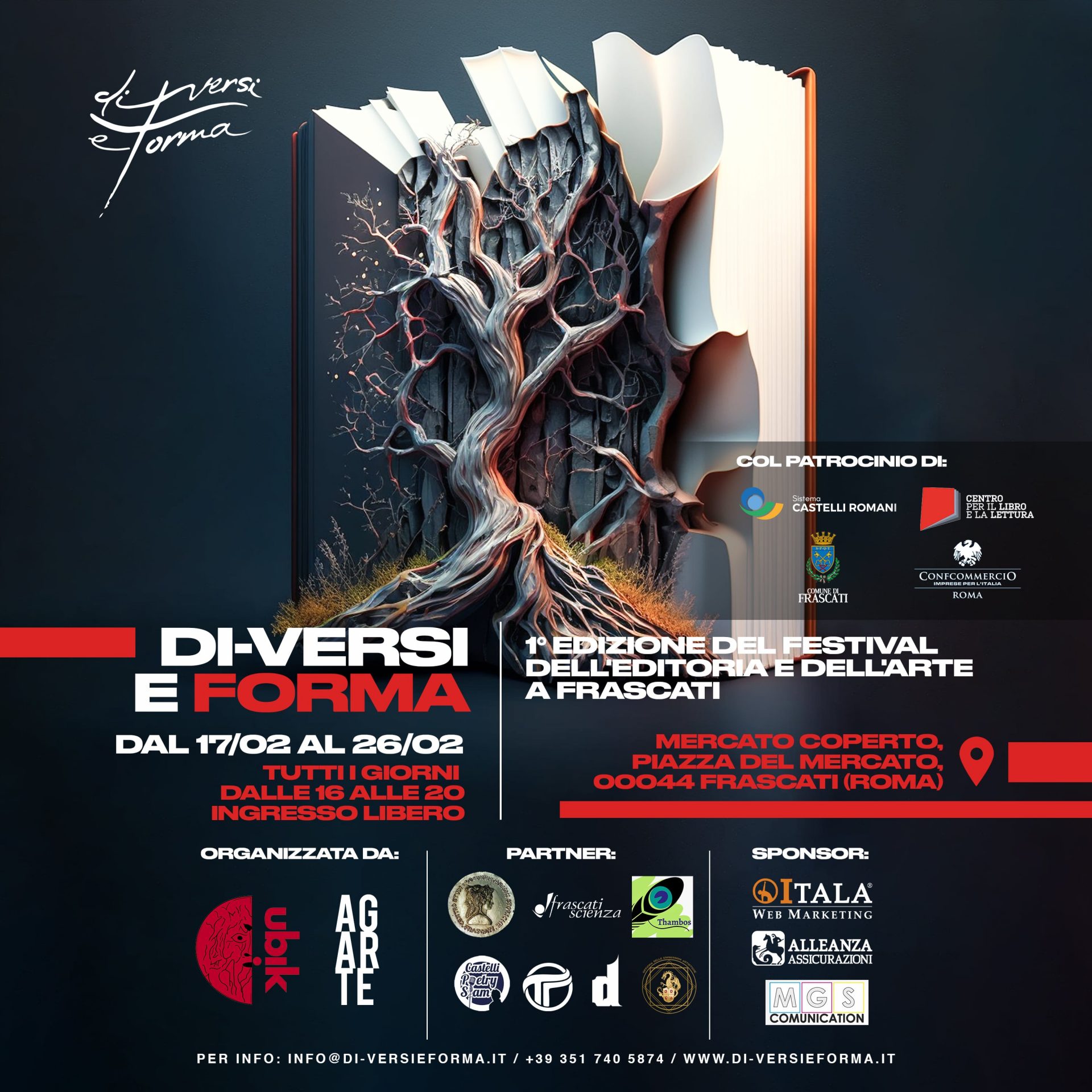 Inserito nel contesto del calendario del carnevale frascatano, “Di-Versi e Forma” con la sua prima edizione si terrà all’interno della location comunale del Mercato Coperto in Piazza del Mercato a Frascati (Roma). L’importante evento promuoverà e divulgherà il lavoro di scrittori, editori, poeti, artisti emergenti e non, e di divulgatori culturali. Questa 1°edizione sponsorizzata da Alleanza Assicurazioni, ITALA s.r.l., MGS Solutions Frascati e con partner Frascati Scienza, Territorio Tuscolano, ODEA Frascati, DAMA Galleria, Poetryslam, Associazione Thambos ed il Centro studi e documentazioni storiche Frascati, si prefigge il compito di presentare tramite un fitto calendario composto di eventi in sinergia tra arte ed editoria, l’odierno e variegato panorama culturale. Grazie alla collaborazione tra Agarte ed Ubik Frascati, si propone una rassegna aperta gratuitamente al pubblico tutti i giorni dalle 16 alle 20 (da venerdì 17 a domenica 26 febbraio 2023).