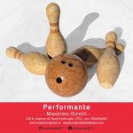 La scultura “Performante” esplora il rapporto tra materia, luce e colore, fondendo le cromie naturali delle pietre con le ombre per creare una tensione visiva che invita alla riflessione. Composta da cinque elementi – quattro birilli e una palla da bowling – l’opera rappresenta il momento sospeso in cui i birilli stanno per cadere. Il singolo birillo ancora in piedi simbolizza l’equilibrio precario, mentre la tensione tra movimento e stasi invita a meditare sull’impermanenza del gesto umano e sul processo creativo.