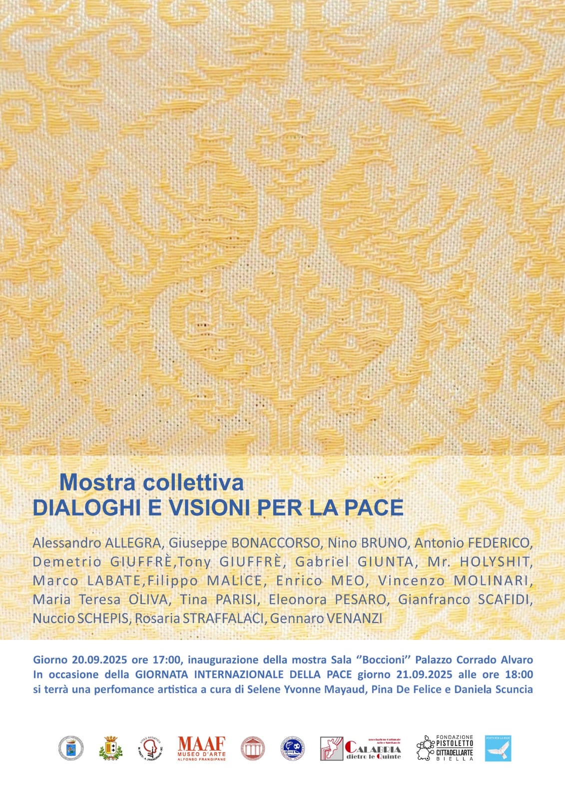 Mostra collettiva DIALOGHI E VISIONI PER LA PACE, Sala Umberto Boccioni di Palazzo Corrado Alvaro Reggio Calabria dal 20 al 28 settembre 2025 -Inaugurazione della mostra il 20 settembre 2025 ORE 17:00 con la presenza degli artisti.