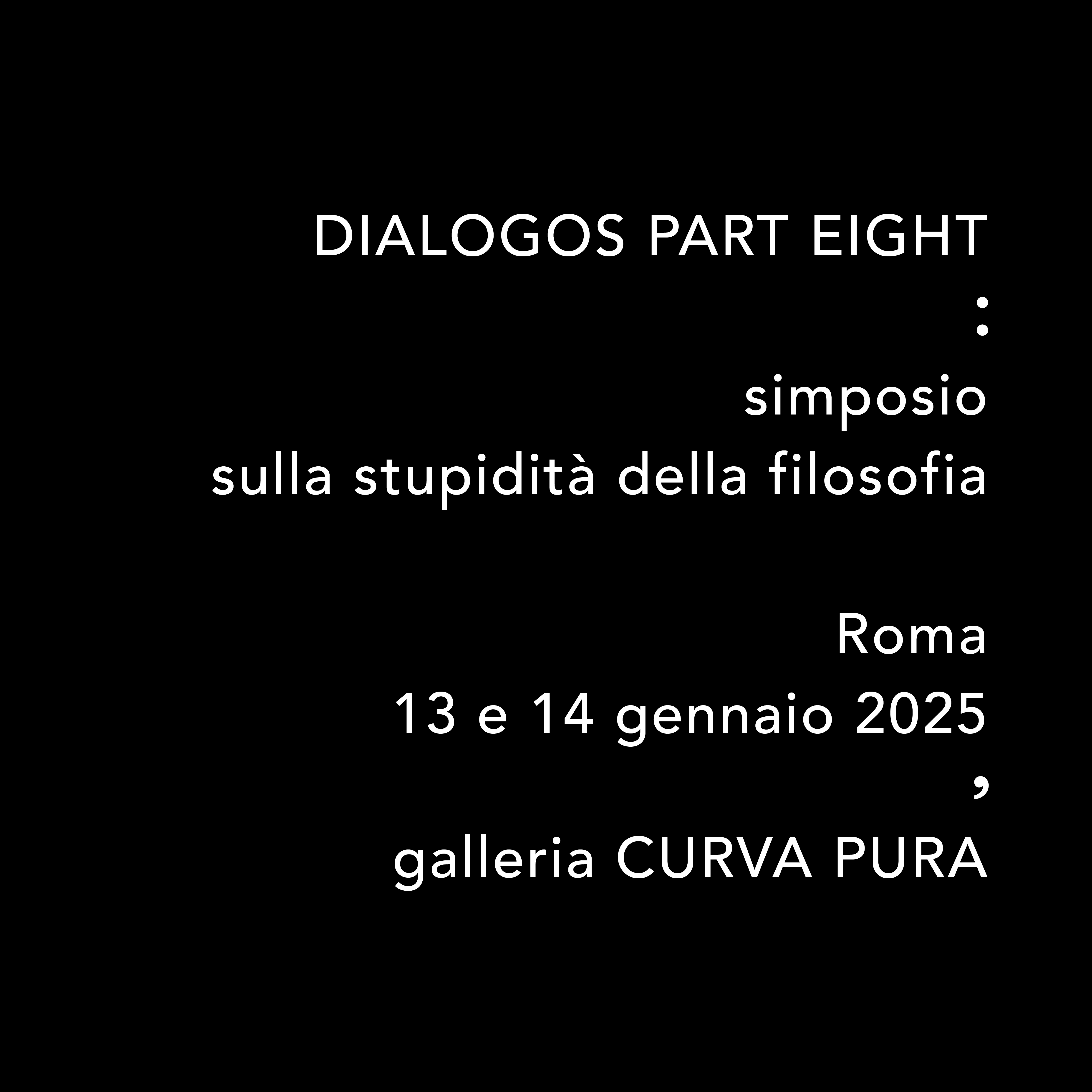 DIALOGOS PART EIGHT è un progetto relazionale di Ermanno Cristini e Giancarlo Norese, sviluppato da Pasquale Polidori nelle forme operative di un simposio SULLA STUPIDITÀ DELLA FILOSOFIA in dialogo compositivo e con la cura di Michela Becchis.