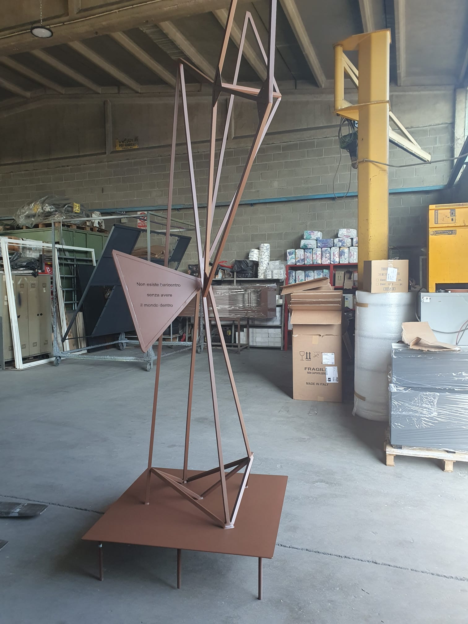 “La scultura - spiega l’artista - rimanda a un dinamismo del divenire e offre visioni diverse in base all’angolazione dalla quale la si osserva. Le forme mutano nel loro apparire e dialogano con la percezione di chi le guarda rappresentando l’essenza stessa del vissuto. Le sembianze senza distinzione di genere ed età generano un segno tangibile di presenze nel quotidiano, quasi un grido d’amore per chi è destinato a restare. È realizzata con l’impiego dell’acciao, un materiale che, seppur greve, mantiene forma e sostanza, accresciute dal continuo naturale invecchiamento cui è sottoposto”. Attigua alla scultura ci sarà una panca, offerta come seduta discontinua e irregolare con scalfita la frase di Cicerone: La memoria è tesoro e custode di tutte le cose”.