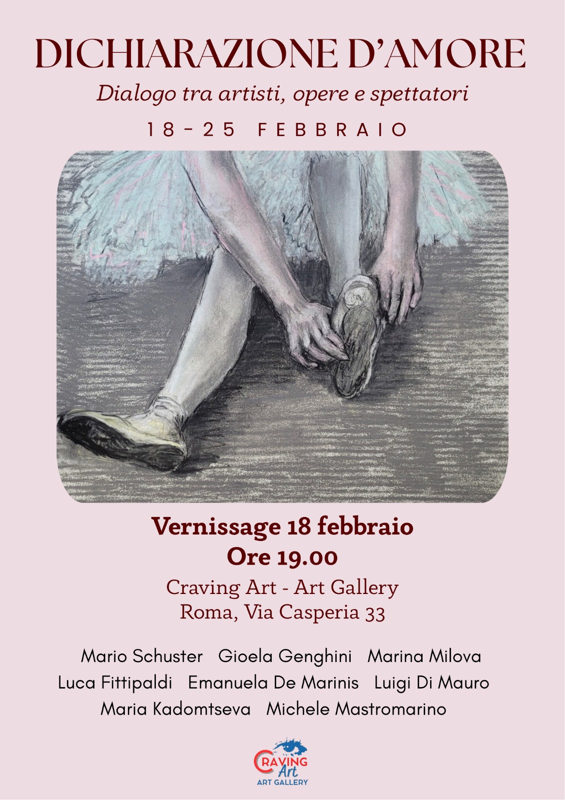 Opening: 18 febbraio 2026, ore 19:00 Ingresso libero e aperitivo Via Casperia 33 – Roma, zona Trieste In mostra dal 18 al 25 febbraio 2026, ore 16:00–20:00 (lun–sab)