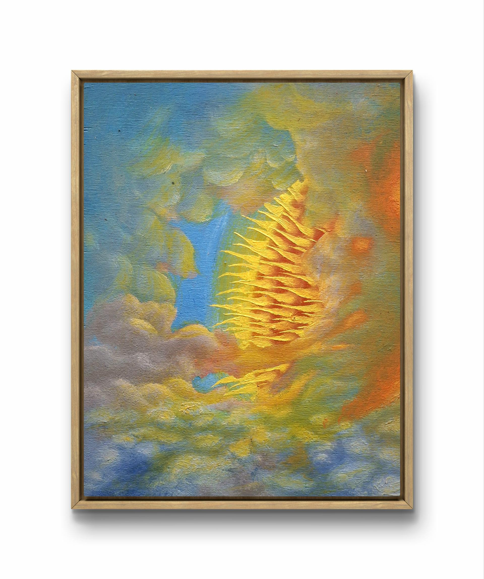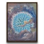 Nella serie “Il sole da giovane”, piccoli dipinti a olio su tavola trovano nei confini imposti dalla cornice la sensazione rassicurante di contenere un pezzo di universo. Questi lavori comunicano la loro autonomia, identificativi di un tempo circolare che si risolve e continuamente riparte. Il sole è nella sua adolescenza, nel pieno della sua potenza, ma tra sei o sette miliardi di anni morirà, come tutti gli esseri viventi. Timidamente questi soli sembrano cercare il loro spazio tra il diradarsi dell’atmosfera, pulsando di un’energia potente, adolescenziale, e per questo anche inconsapevole e incerta. Lingue di fuoco protendono all’esterno come tentacoli, contenendo nella loro stessa forma l’allusione a qualcosa di biologico, alla potenza della vita nell’aspetto di un fiore o di un virus.