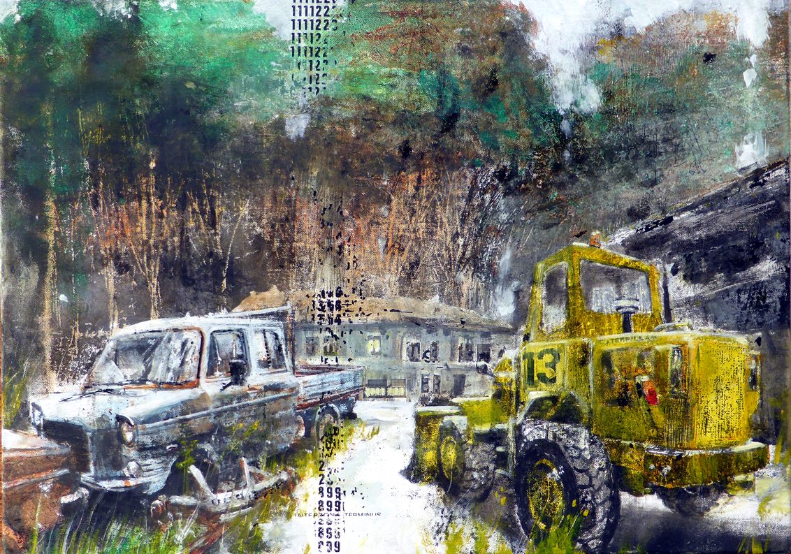 Gli ultimi lavori di Scursatone ritraggono quell’Italia rurale che molti conoscono per esperienza diretta: basta attraversare le campagne per vedere vecchie macchine agricole, copertoni e automobili in disuso.
