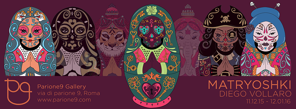 Diego Vollaro, attraverso tecniche tipiche dell’arte pop, dal colore compatto, non sfumato e “industriale” alla ripetitività dell’immagine, crea travestimenti che permettono alle sue matrioske di assumere diverse identità, ognuna con la propria storia da raccontare e svelare, non più da celare.