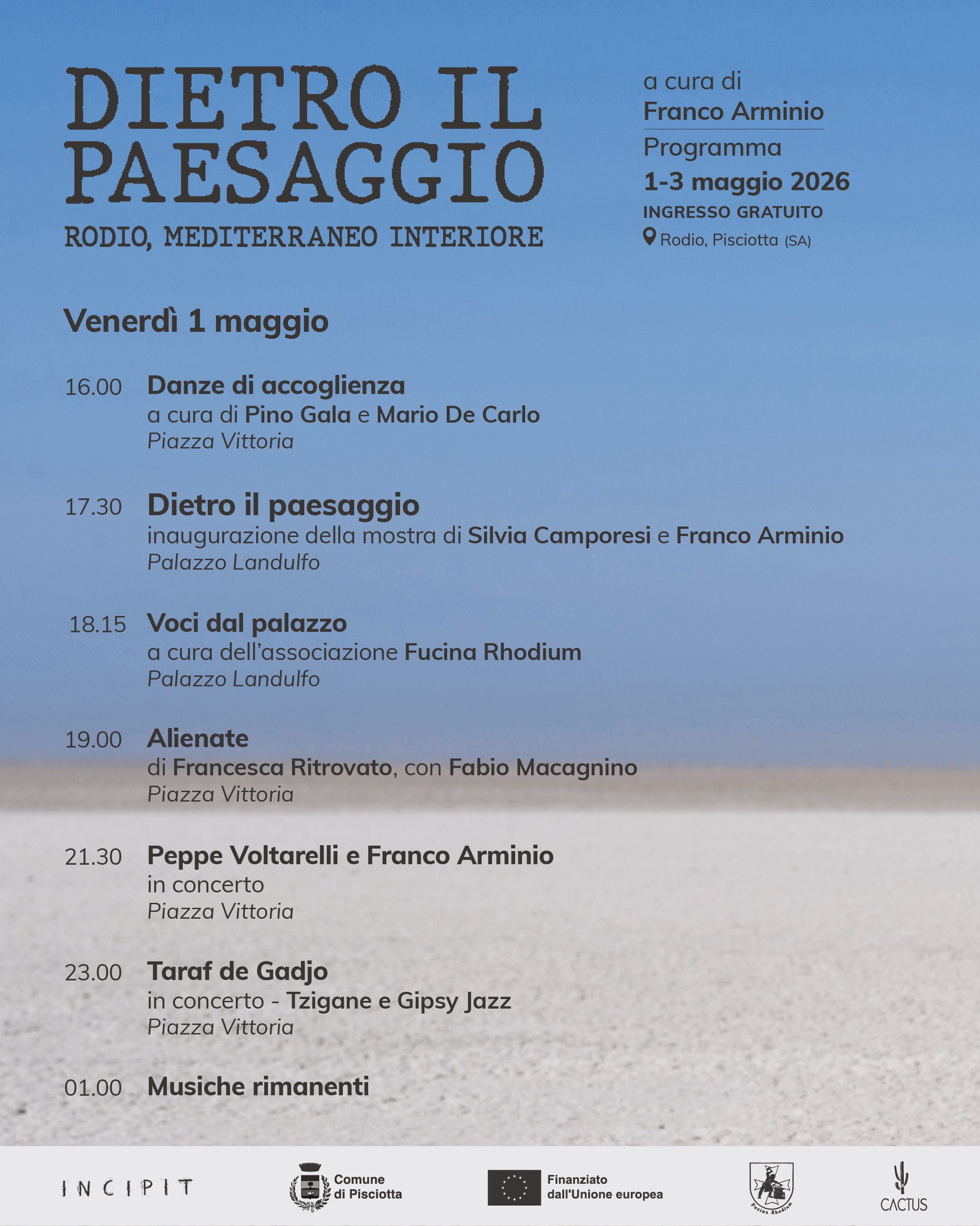 Dietro il Paesaggio - Rodio, Mediterraneo Interiore è realizzato con il Comune di Pisciotta e finanziato dall’Unione Europea, in collaborazione con Fucina Rhodium, Cactus Public Art e Noema Comunicazione. Il progetto si inserisce all’interno di un percorso già avviato da Incipit con l’obiettivo di contribuire al consolidamento del territorio pisciottano come centro culturale stabile e di promuovere una fruizione consapevole dei luoghi, a partire dalle persone che li abitano.