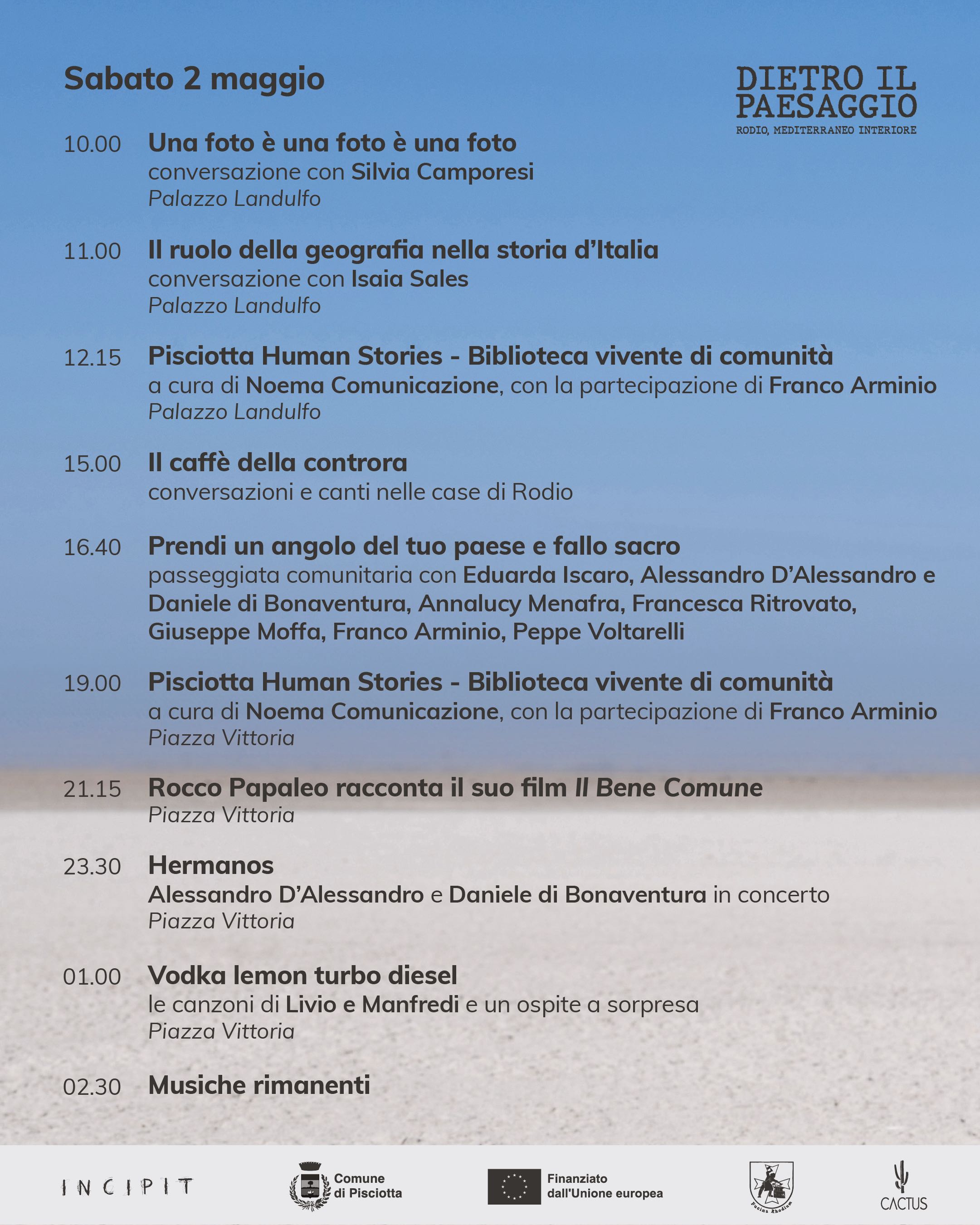 La dimensione musicale attraversa il festival con il concerto di Peppe Voltarelli, protagonista di un incontro con Franco Arminio che unisce parola poetica e canto, e con le sonorità tzigane dei Taraf de Gadjo. A questi si affiancano il monologo teatrale Alienate di Francesca Ritrovato con le musiche originali dal vivo di Fabio Macagnino, Hermanos, il concerto di Alessandro D’Alessandro e Daniele di Bonaventura, e momenti musicali notturni che proseguiranno nelle piazze di Rodio. Dietro il Paesaggio ospita momenti di approfondimento dedicati al pensiero contemporaneo, come l’incontro Il ruolo della geografia nella storia d’Italia con lo storico Isaia Sales, e la conversazione Una foto è una foto è una foto con Silvia Camporesi, che prende spunto dal suo ultimo libro pubblicato da Einaudi e offre l’occasione per una riflessione sulla fotografia contemporanea e sulla complessità delle immagini nel presente.