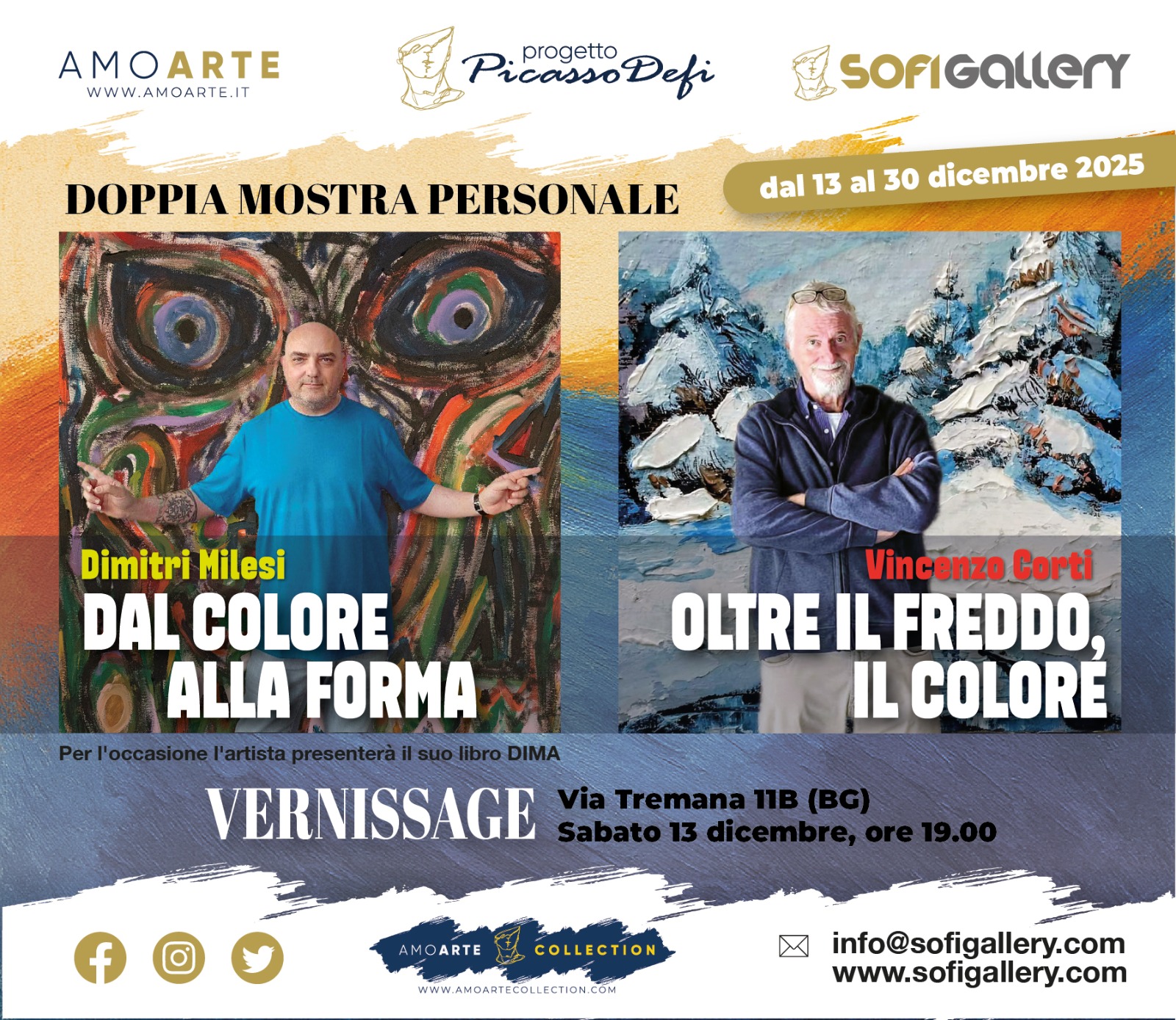 La mostra doppia personale di Dimitri Mlilesi e Vincenzo Corti IL COLORE COME LINGUAGGIO COMUNE inaugura sabato 13 dicembre alle ore 19.00 presso la Sofi Gallery di via Tremana 11B (BG).
