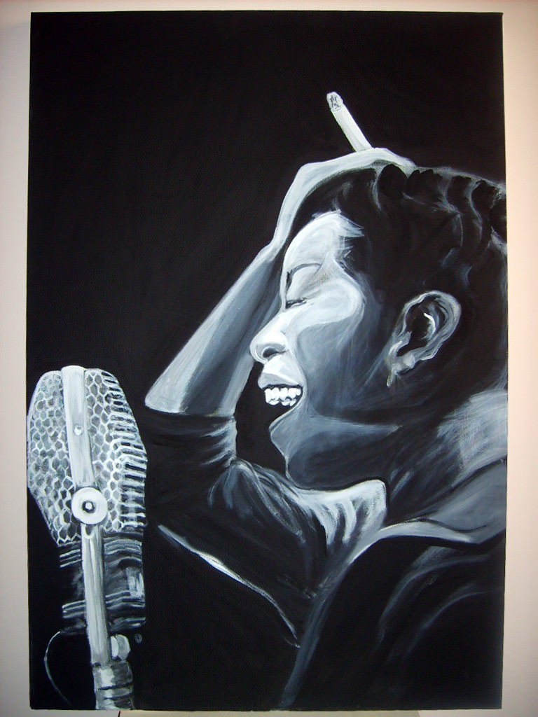 Invisibile, impalpabile, immateriale eppure così energica, coinvolgente, capace di influenzare mode, costumi, generazioni. La musica rappresenta un’espressione profonda della cultura di un popolo e, nello stesso tempo, possibilità di comunicare, apertura verso ogni tipo di stimolo, passione. Il Jazz, in particolar modo, si è sviluppato dalla confluenza di tradizioni musicali africane ed europee. Infiniti stili e sottogeneri identificano questa forma d’arte, frutto di costanti contaminazioni, che è arrivata ad essere la sintesi tra numerose culture musicali. “Kind of Blue” di Miles Davis, in questo senso, riesce in modo unico e inconfondibile a integrare, in un’opera compiuta, tutte le componenti specifiche di questo genere musicale. A tale capolavoro, nel 50esimo anniversario dalla pubblicazione e al suo straordinario autore, creatore di numerosi stili Jazz, è dedicata una serie di ritratti eseguiti da Luca Bertolotti, a cui vengono accostati alcuni acrilici di Dina Bertolotti, esposti all’interno del PalaJazz in occasione del Fano Jazz Festival. Si sviluppa in tal modo una sinergia, fra l’evento musicale e i differenti modi di trattare i soggetti rappresentati da parte degli artisti, che prosegue all’Exhibition Art Gallery. In questa sede, in contemporanea con la mostra al PalaJ, i due artisti si trovano nuovamente vicini ma con una sostanziale differenza. In Galleria, infatti, Luca Bertolotti presenta una serie di opere su carta di piccolo formato, mentre lo spazio maggiore viene riservato a Dina Bertolotti. L’attenzione dell’artista si sofferma sulle grandi protagoniste femminili della musica Jazz. Ritratti in bianco e nero dove la comparsa di un po’ di colore rosso è un’eccezione concessa per rendere in maniera maggiormente efficace l’esuberante fisicità e la ricchezza vocale di Ella Fitzgerald. Una scelta, quella di usare il bianco e nero, che esprime l’intenzione di concentrare l’attenzione su un determinato periodo storico, astraendolo dal prima e dal dopo, dall’inarrestabile divenire degli eventi. Contribuisce a situare temporalmente l’immagine anche la presenza costante, in ogni opera, di un microfono. Questo oggetto, attraverso la sua forma, rimanda direttamente alla metà del secolo scorso e si carica di una funzione ulteriore. Acquisisce la valenza di indizio nel riferirsi a qualcosa che non è possibile vedere. La musica è nell’aria, infatti, il momento che viene fermato, sottratto al tempo, è quello dell’esecuzione canora. Le protagoniste vengono rappresentate mentre cantano, nell’attimo stesso in cui utilizzano il loro inestimabile strumento vocale, rendendo con efficacia una delle qualità più alte della musica Jazz: l’improvvisazione. Un aspetto che finisce per far diffondere, tutto intorno a noi, quell’avvolgente sensazione data dalla presenza della musica, che ha inizio dalla superficie pittorica. L’immagine, in tal modo, funziona come fosse una testimonianza dove, attraverso i volti di queste grandi donne del Novecento, con le loro personalità e voci inconfondibili, viene fissato sulla tela un periodo indimenticabile della storia della musica.
