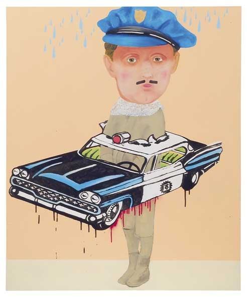 M. R.: Ho una specie di piccola agenda dove annoto titoli di canzoni, fatti di cronaca che sento in tv. É un piccolo diario dove scrivo progetti, disegno qualsiasi cosa che sento e che reputo interessante o che in qualche modo può contaminare il mio lavoro. Diciamo quindi che la prima fase è cercare in questo diario, negli appunti. Poi inizio a disegnare. Ho una passione smodata per il pennarello, che uso spesso su lucido, preparandolo come una specie di cliché che poi trasferisco sulla tela insieme ad altri elementi che disegno direttamente con altri pennarelli. L'effetto del pennarello del lucido è il mio marchio di fabbrica. La prima fase è sempre su lucido perché poi posso riutilizzare il disegno anche in altri progetti perché adoro la ripetizione iconografica. La terza fase è quella che io chiamo "remix" e che consiste nello scegliere tra le mie foto o i miei disegni, un'ambientazione per i miei personaggi. Il mio è un lavoro che trae ispirazione dalla realtà, ma nel passaggio sulla tela si trasforma in fiction, in un non-fumetto metropolitano molto pop 'n' roll!