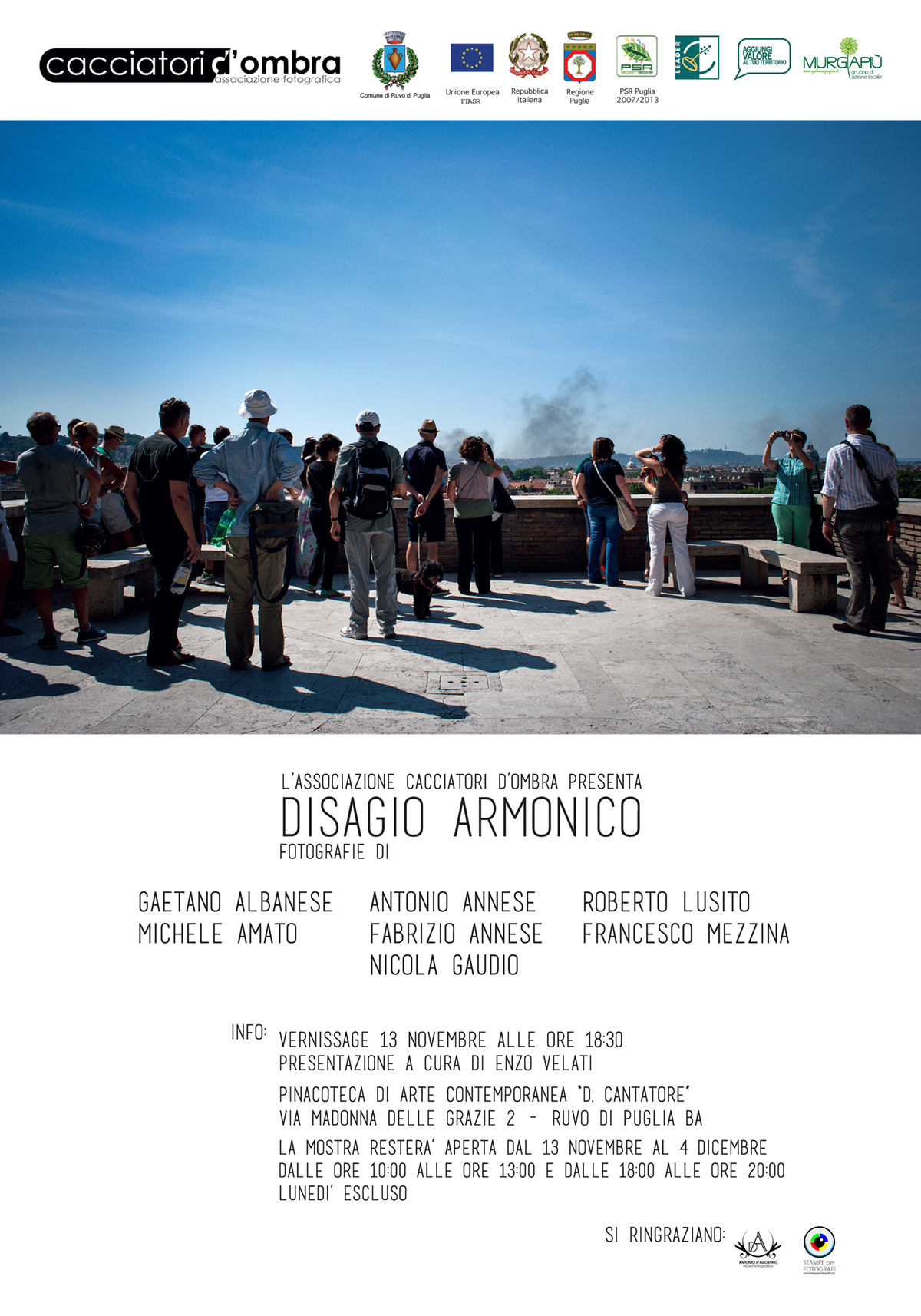 L’Associazione fotografica Cacciatori d’Ombra presenta la mostra di opere fotografiche dal titolo Disagio Armonico. Oltre cinquanta fotografie realizzate da sette fotografi. La mostra si inaugurerà il giorno 13 novembre alle ore 18.30 nella Pinacoteca Contemporanea d’Arte Contemporanea di Ruvo di Puglia (dedicata a Domenico Cantatore) e vedrà la partecipazione di Enzo Velati, critico della cultura fotografica, che presenterà la mostra.