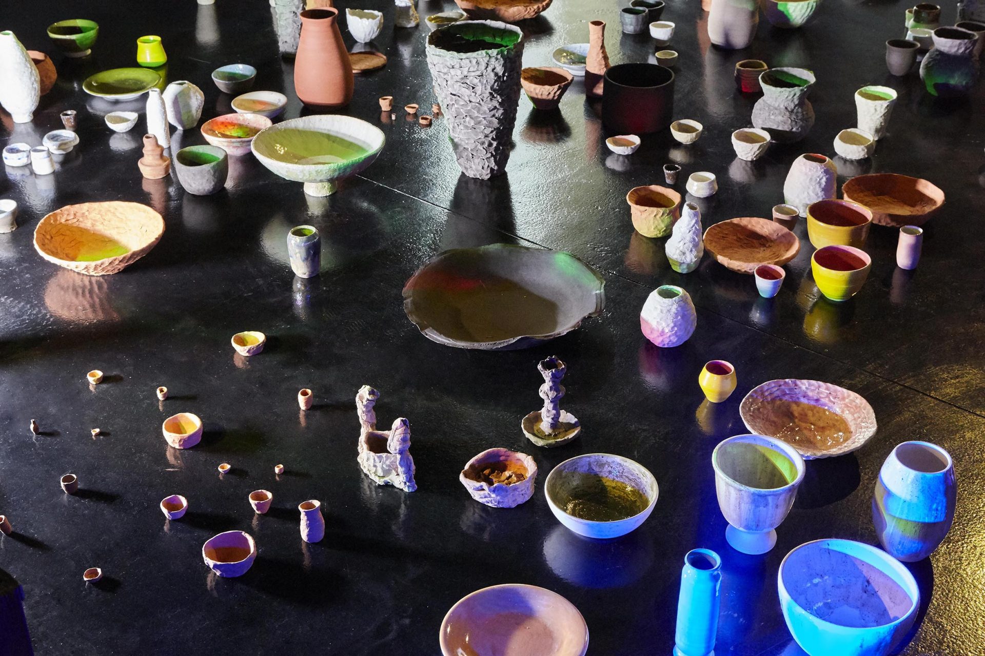 La pratica romantica e quasi sacrale del vasaio, demiurgo assorto nel voler fare le cose “come si deve” che segue rigidi dettami e antiche tecniche, viene trasposta in un locale notturno, dove le persone sono invitate a liberarsi da schemi comportamentali. Mescolando sacro e profano, la galleria si trasforma in discoteca, il torniante diventa dj, i visitatori sono invitati a ballare, contemplare, fare. Le regole si sovvertono, il tornio diventa una danza, un’attività estatica e liberatoria. Una festa a cui tutti sono invitati a partecipare, e allo stesso tempo un workshop, un lavoro collettivo. Chiara Camoni scardina così le gerarchie intellettuali, le tecniche pedagogiche, alcuni miti dell’artigianato e del progresso, in parte interpretando il pensiero del filosofo francese Jacques Rancière ne Il maestro ignorante: “il sapere non è nulla, e invece fare è tutto, le scienze non sono fatte per essere spiegate ma per produrre delle nuove scoperte e delle invenzioni utili”.