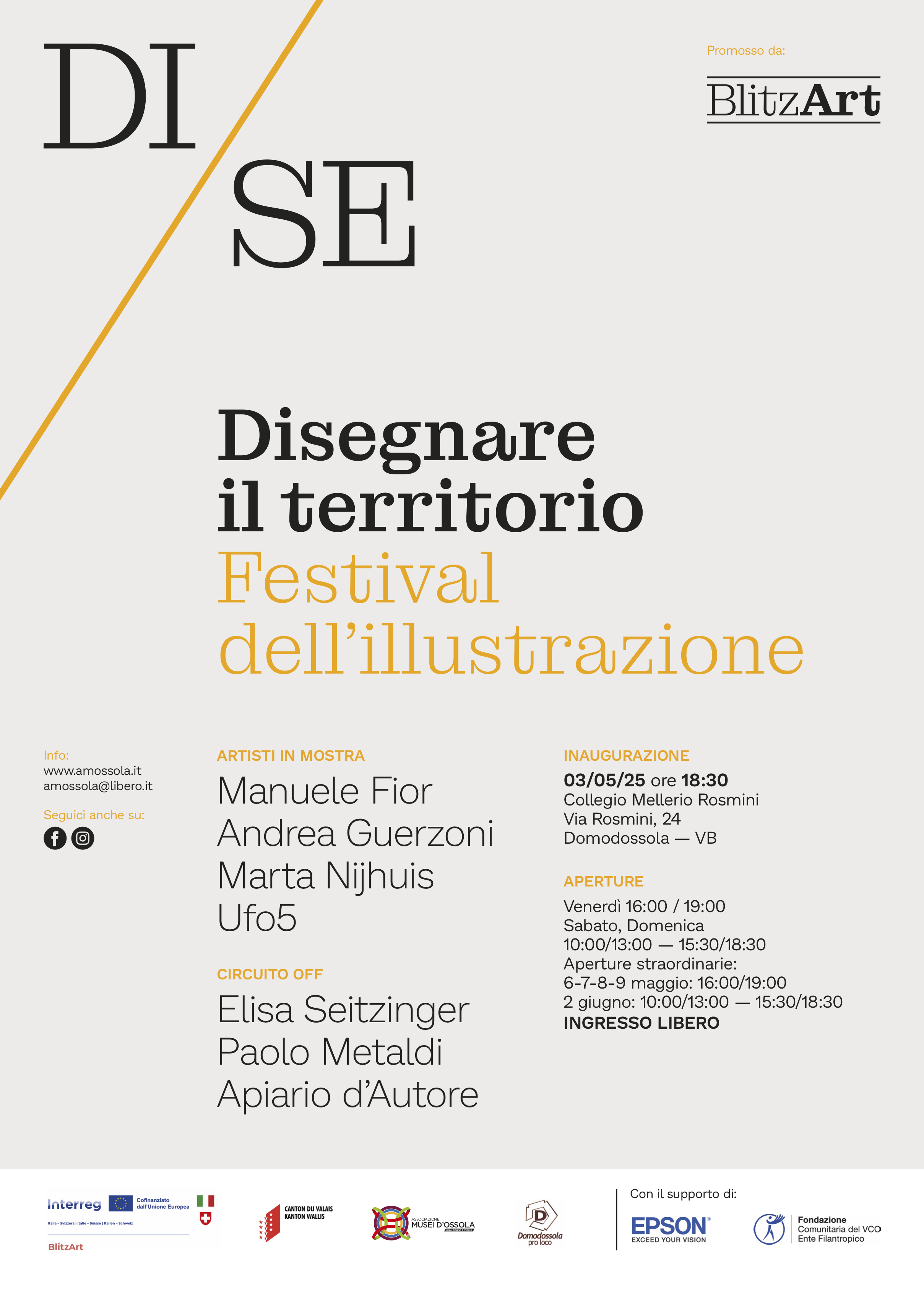 Torna la quinta edizione del Festival dell’illustrazione Di-Se x BlitzArt, da sabato 3 maggio a domenica 8 giugno a Domodossola (VB). Un appuntamento che, anno dopo anno, sta diventando tra i più vivaci e originali all’interno del panorama nazionale. Nato nel 2021 nell’ambito del progetto Interreg “Di-Se – DiSegnare il territorio”, è un festival giovane che continua a sorprendere e a costruire una frizzante rete di artisti e creativi intorno al tema del disegno e dell’illustrazione: potenti strumenti per riflettere e raccontare il mondo che ci circonda. L’edizione 2025 fa parte del nuovo Interreg Italia-Svizzera “SensibilizzArte – l’arte come strumento di sensibilizzazione”, percorso transfrontaliero triennale che vuole unire arte, natura e tradizione per promuovere sostenibilità e turismo consapevole.