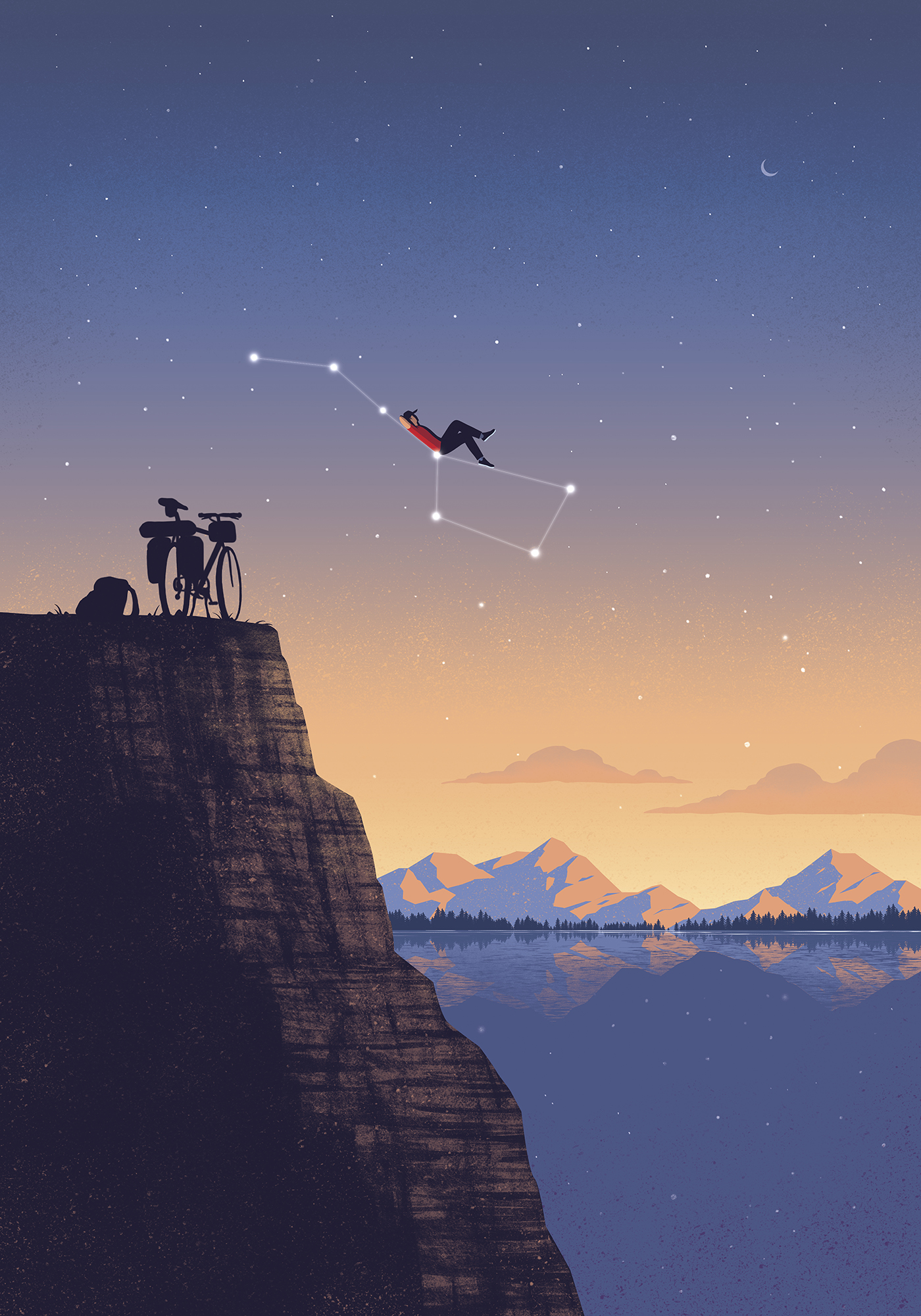 Davide Bonazzi sceglie come filo conduttore per In viaggio – On the Road il tema dell’esplorazione e della scoperta. Il viaggio porta con sé aspettative e ostacoli, sogni da realizzare e difficoltà da lasciarsi alle spalle, o, semplicemente, voglia di rilassarsi e guardare altrove. Le opere sono una selezione di lavori realizzati per finalità e contesti eterogenei, da copertine di libri a campagne pubblicitarie, da illustrazioni editoriali a progetti personali.