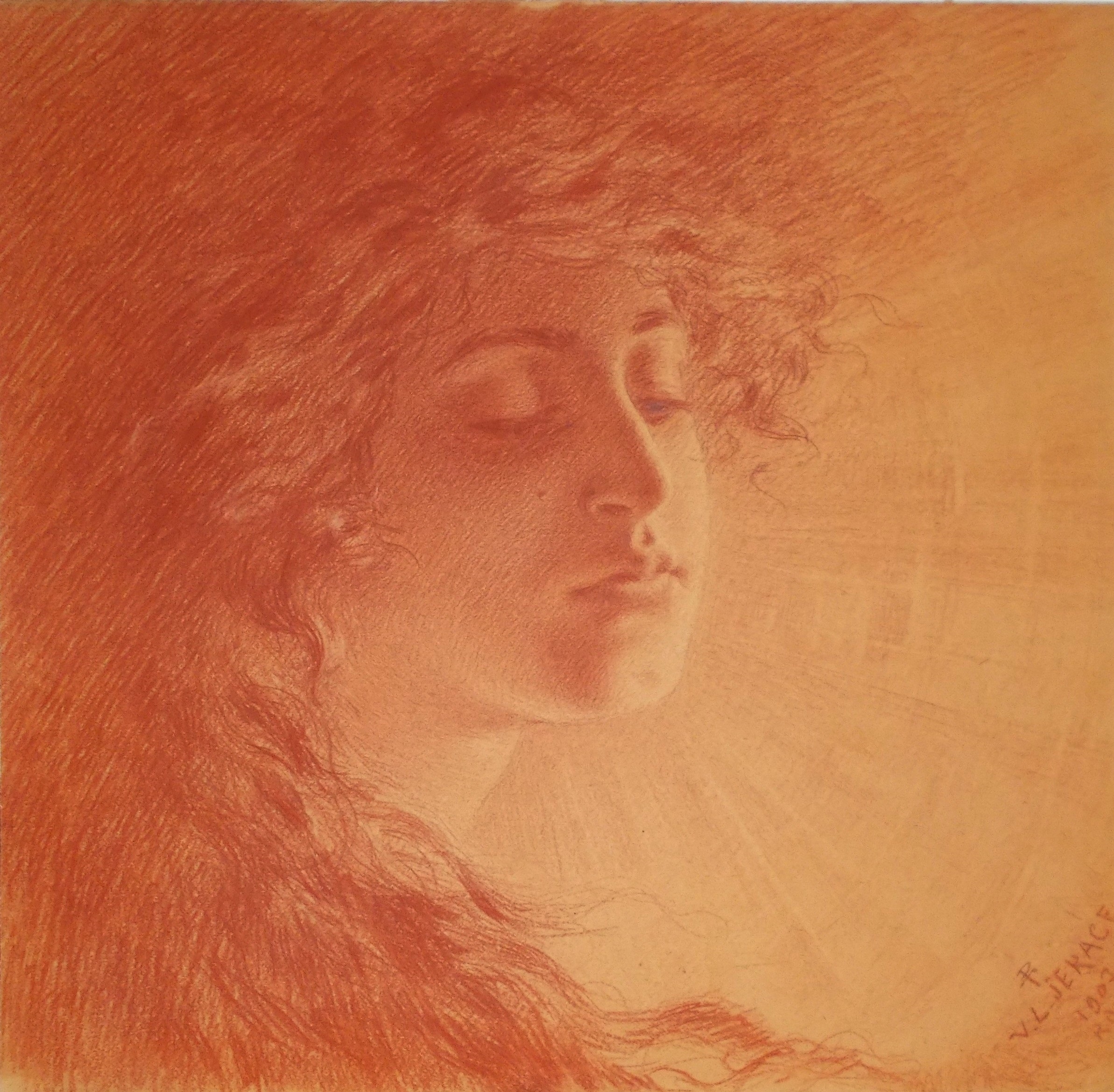 Quasimodo; un ritratto femminile a sanguigna, con sole nascente sullo sfondo realizzato da Vincenzo Jerace