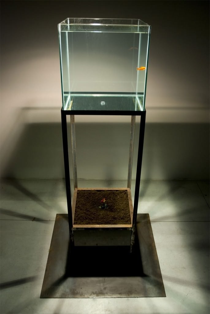 Per questa occasione, Studio ++ espone Senza titolo, un’installazione alta circa 2 metri, una metafora crudele del rapporto tra vita e morte; una sorta di colonna dove, in alto, un acquario con dentro un pesce rosso si contrappone a un vaso colmo di terra con in mezzo un germoglio, all’estremo in basso. Lentamente, con regolarità, gocce d’acqua cadono dall’acquario verso il vaso, togliendo metaforicamente vita al pesce e donandola al germoglio. Un togliere e un donare lento, reciproco, incessante che crea una tensione tra i due elementi, l’acqua e la terra.