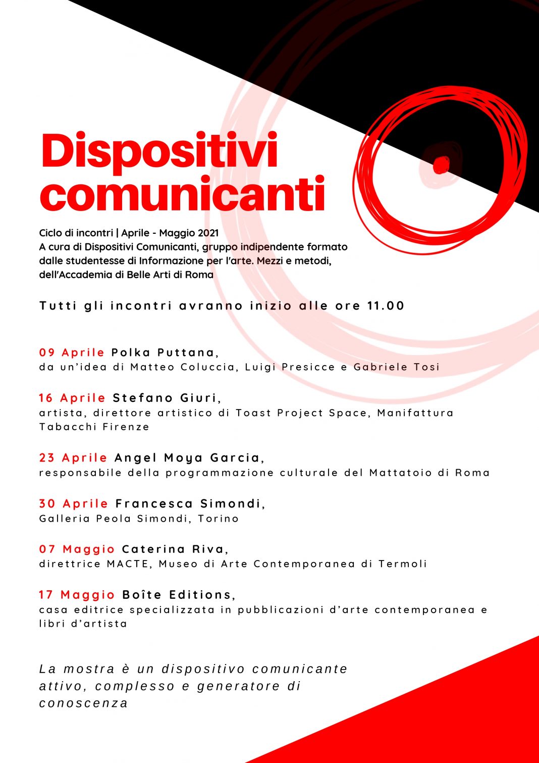 Ciclo di incontri a cura di Dispositivi Comunicanti, gruppo indipendente formato dalle studentesse di Informazione per l’arte: Mezzi e Metodi, dell’Accademia di Belle Arti di Roma.