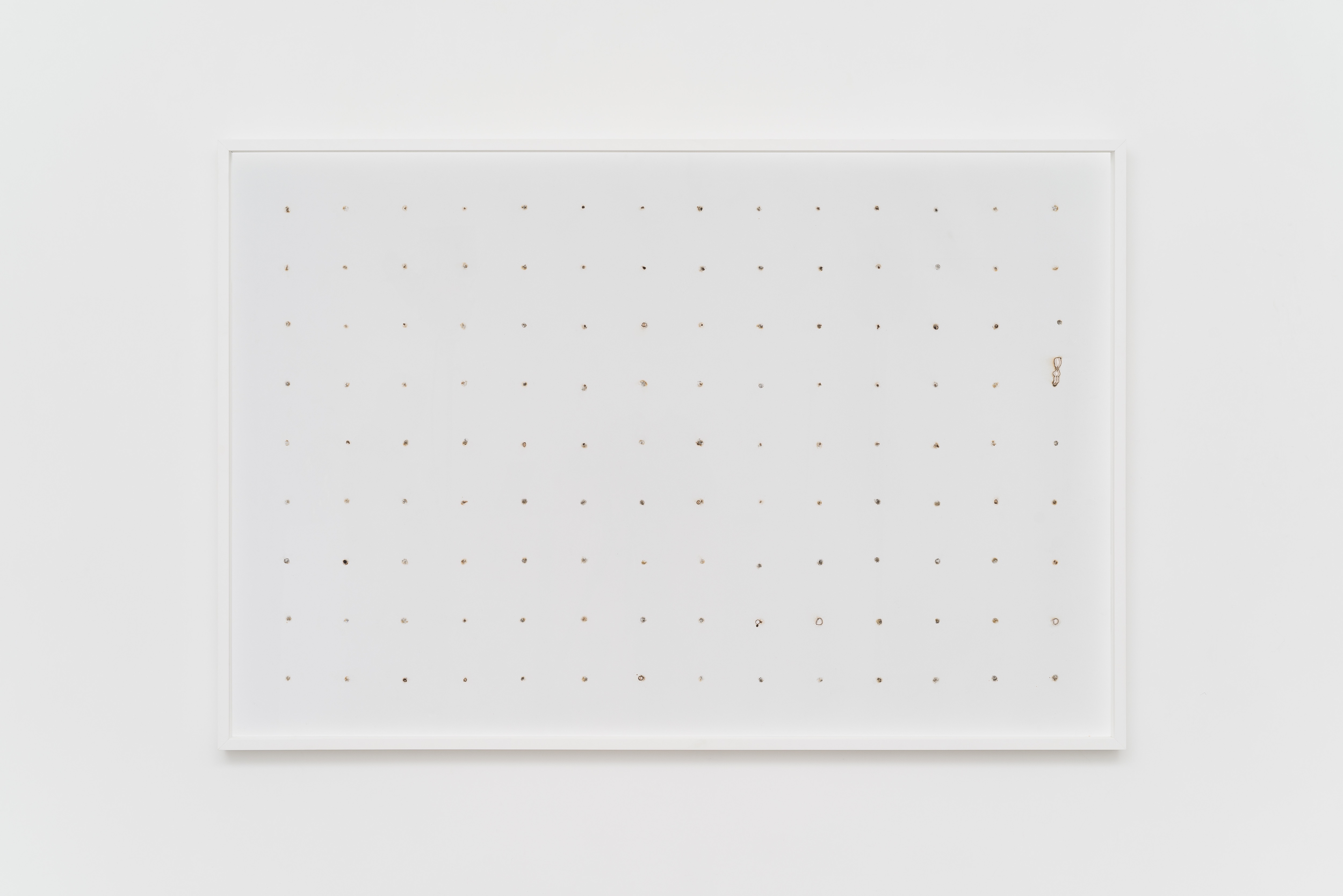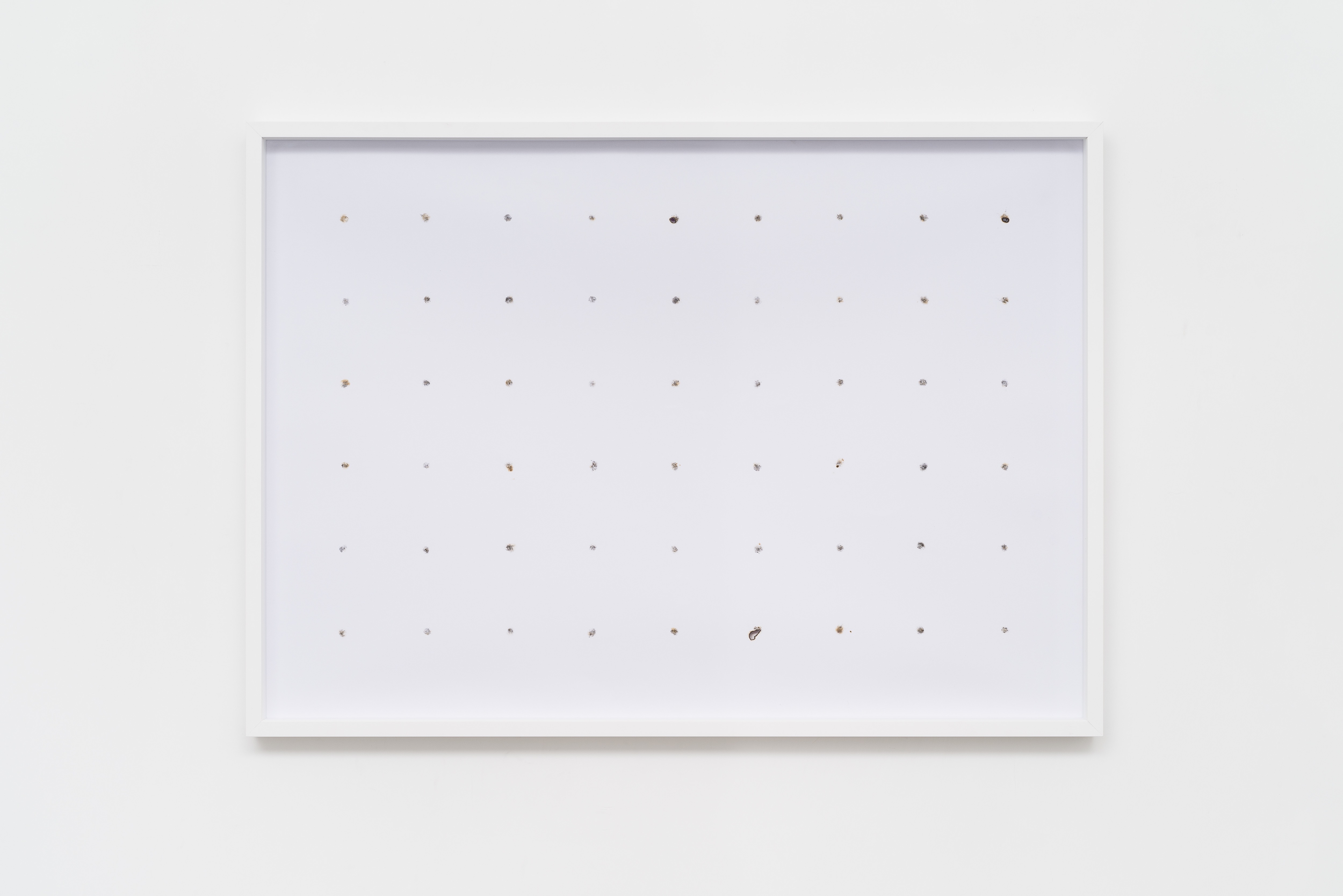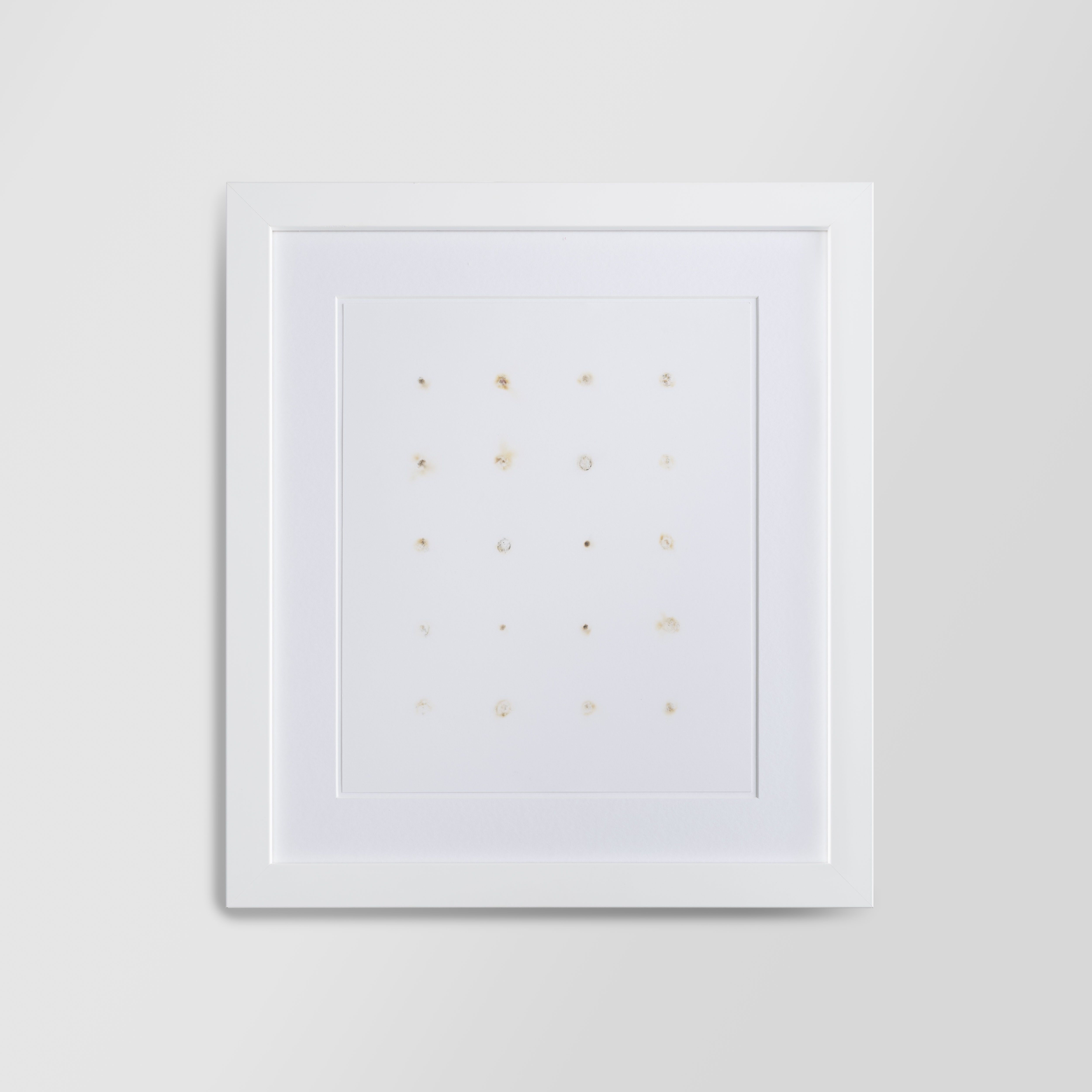 d’istante è un viaggio intimo e concettuale. Il tempo è reso visibile attraverso un gesto dell’artista, tanto semplice quanto potente, che deposita delle tracce effimere sulla carta bianca. Prende forma un archivio temporaneo, scandito dall’automatismo dell’atto artistico che si confronta con la casualità del materiale. Viene così a generarsi un unico pattern, nel quale ogni segno rappresenta metaforicamente un istante della vita. Tra le due dimensioni della superficie si scandisce il tempo, come accade sulla pagina bianca e vuota di un diario. Talvolta viene riprodotto un momento solitario mentre in altre la condivisione diventa la protagonista, invitando lo spettatore a riflettere sulla fragilità del tempo e della memoria.