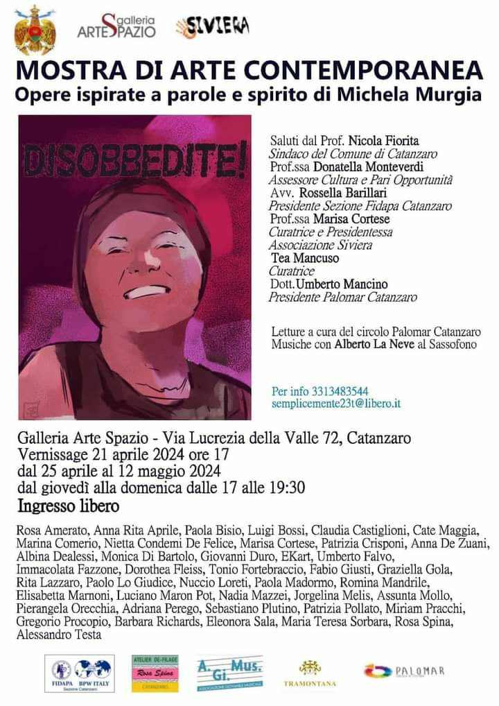 Il 10 agosto 2023 moriva la grande scrittrice attivista Michela Murgia: “Non siate mai schiavi! Disubbidite” diceva ai ragazzi. Nella sua breve ma intensa vita, Michela ha ispirato e incoraggiato una vastità di donne. Da qui il nostro progetto “Disubbidite!” : un evento artistico letterario musicale sui temi a lei cari, con l’intento di mantenere nelle coscienze una sano senso critico. In mostra diversi artisti nazionali e stranieri, ognuno dei quali tenta di svelare le fragilità, lo splendore e le sfumature delle anime inquiete delle donne. Gli artisti che espongono sono: Rosa Amerato- Anna Rita Aprile-Paola Bisio-Luigi Bossi-Claudia Castiglioni- Cate Maggia- Marina Comerio- Nietta Condemi De Felice- Marisa Cortese- Patrizia Crisponi - Anna De Zuani - Albina Dealessi- Monica Di Bartolo- Giovanni Duro- EKart- Umberto Falvo- Immacolata Fazzone- Dorothea Fleiss- Tonio Fortebraccio- Fabio Giusti—Graziella Gola- Rita Lazzaro- Paolo Lo Giudice - Paola Madormo- Romina Mandrile- Elisabetta Marnoni- Luciano Maron Pot- Nadia Mazzei- Jorgelina Melis- Assunta Mollo- Pierangela Orecchia- Adriana Perego- Sebastiano Plutino- Patrizia Pollato- Miriam Pracchi – Gregorio Procopio- Barbara Richards- Eleonora Sala- Maria Teresa Sorbara-Rosa Spina-Alessandro Testa.