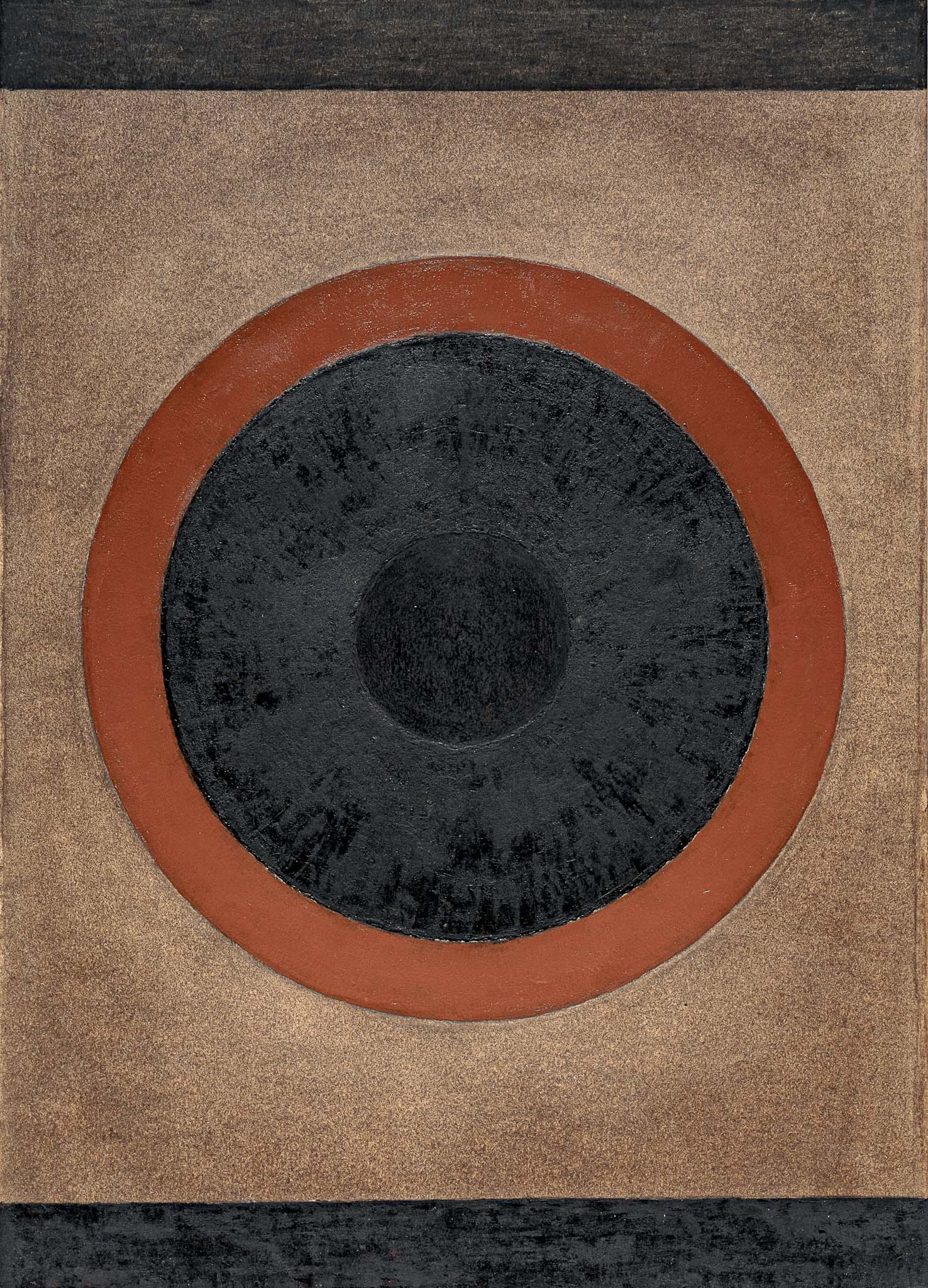 incertezze delinea delle forme che sembrano continuare a modificarsi dinanzi ai nostri occhi. Nei Neri, forme geometriche trattate col bitume, – triangoli, cerchi spirali, rettangoli e trapezi – si manifestano come il risultato di un’azione alchemica.