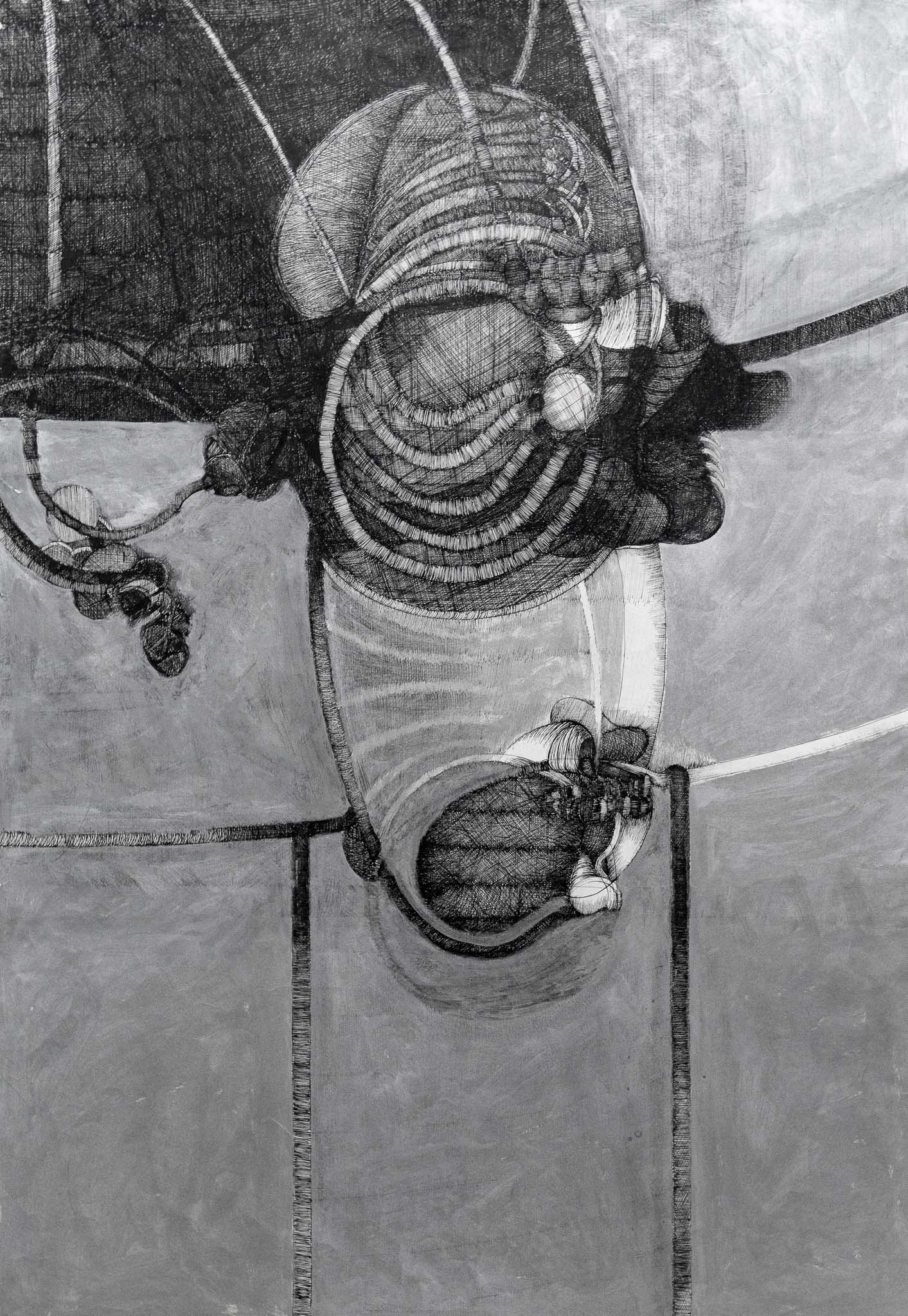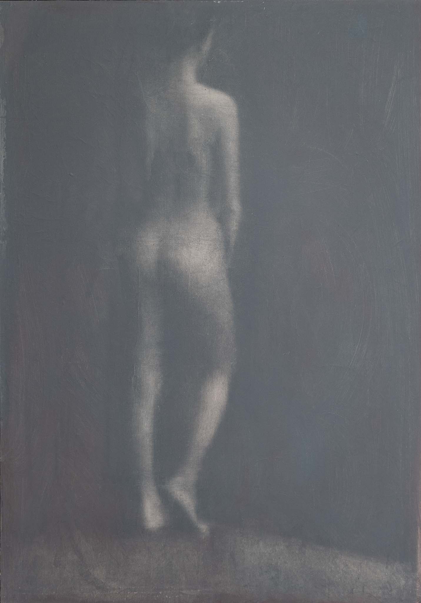 Collocata frontalmente al dipinto, Nostos, scultura in cemento bianco e materiali vari, ci proietta nella vastità della visione del paesaggio. Solo attraversando il lago si sentiva felice è il titolo dell’opera, realizzata su tela con la tecnica dell’overpainted photography, in cui una figura femminile dalle forme sfocate sembra concretizzarsi dalla memoria e dal sogno.