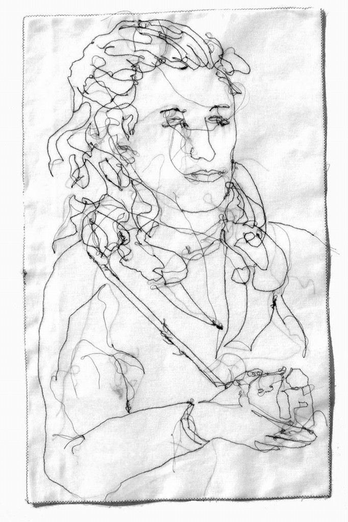 I ritratti di Sabina Romanin sono fili colorati che si incrociano su tela chiara e trasparente quasi a svelare un’essenza pura nel semplice gesto del cucire, che le è familiare fin da bambina e, con il tempo, è diventato un pennello speciale, un carboncino che incide con leggerezza il segno sulla stoffa.