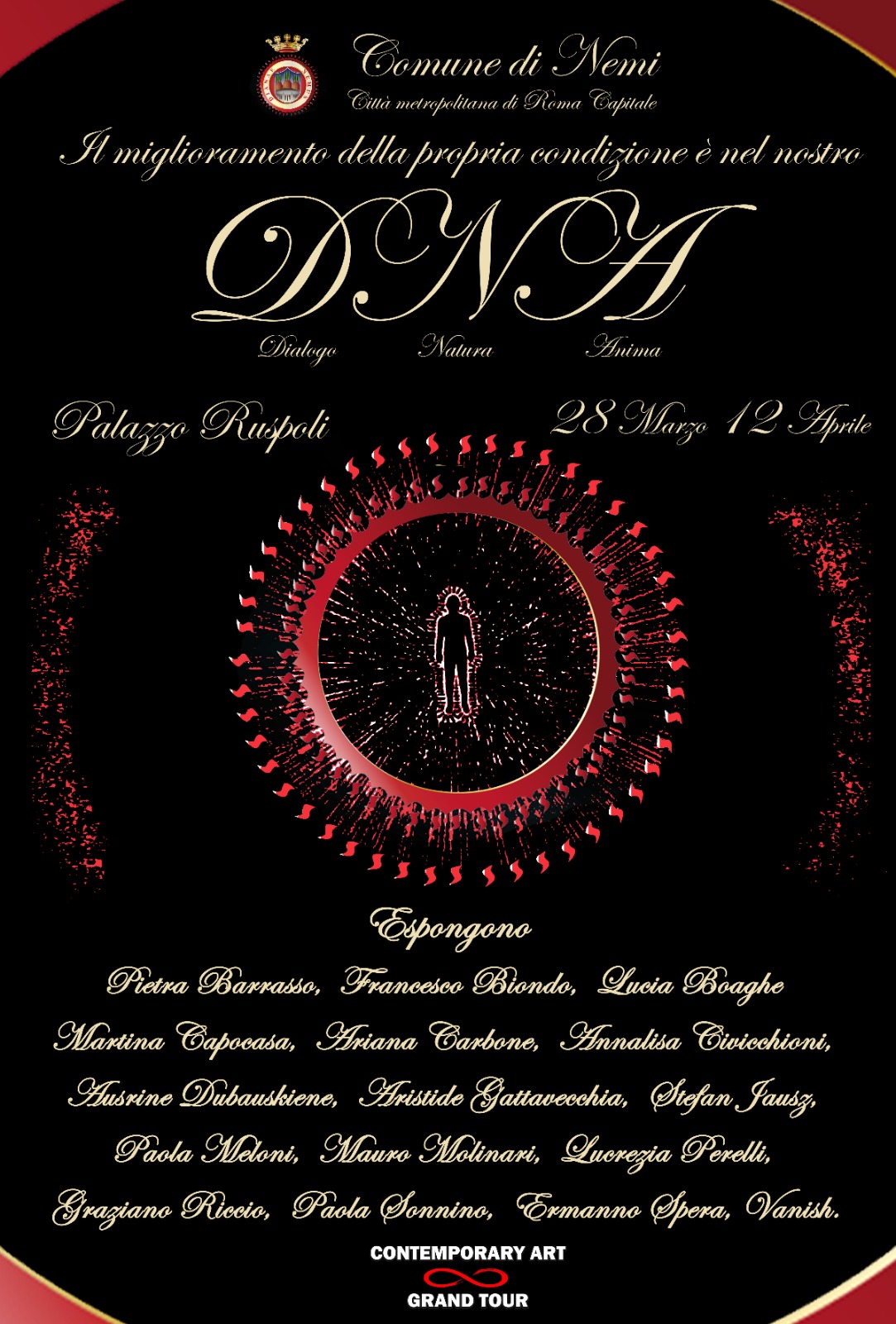 Prosegue il percorso espositivo del Contemporary Art Gran Tour con una nuova tappa che si preannuncia densa di riflessioni e contaminazioni tra linguaggi: “DNA – Dialogo Natura Anima. L’irriducibile essere”, in programma dal 28 marzo al 12 aprile presso Palazzo Ruspoli a Nemi, nel suggestivo territorio dei Castelli Romani.