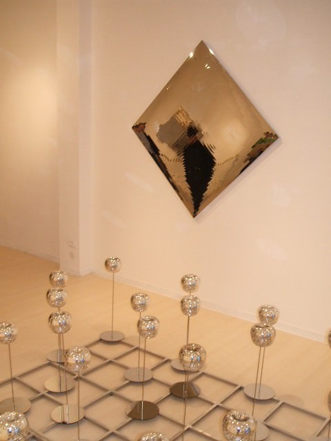 una suggestiva installazione realizzata con sessantaquattro sculture in cristallo specchiato poste in equilibrio su sottilissimi steli in acciaio saldamente ancorati ad un basamento modulare