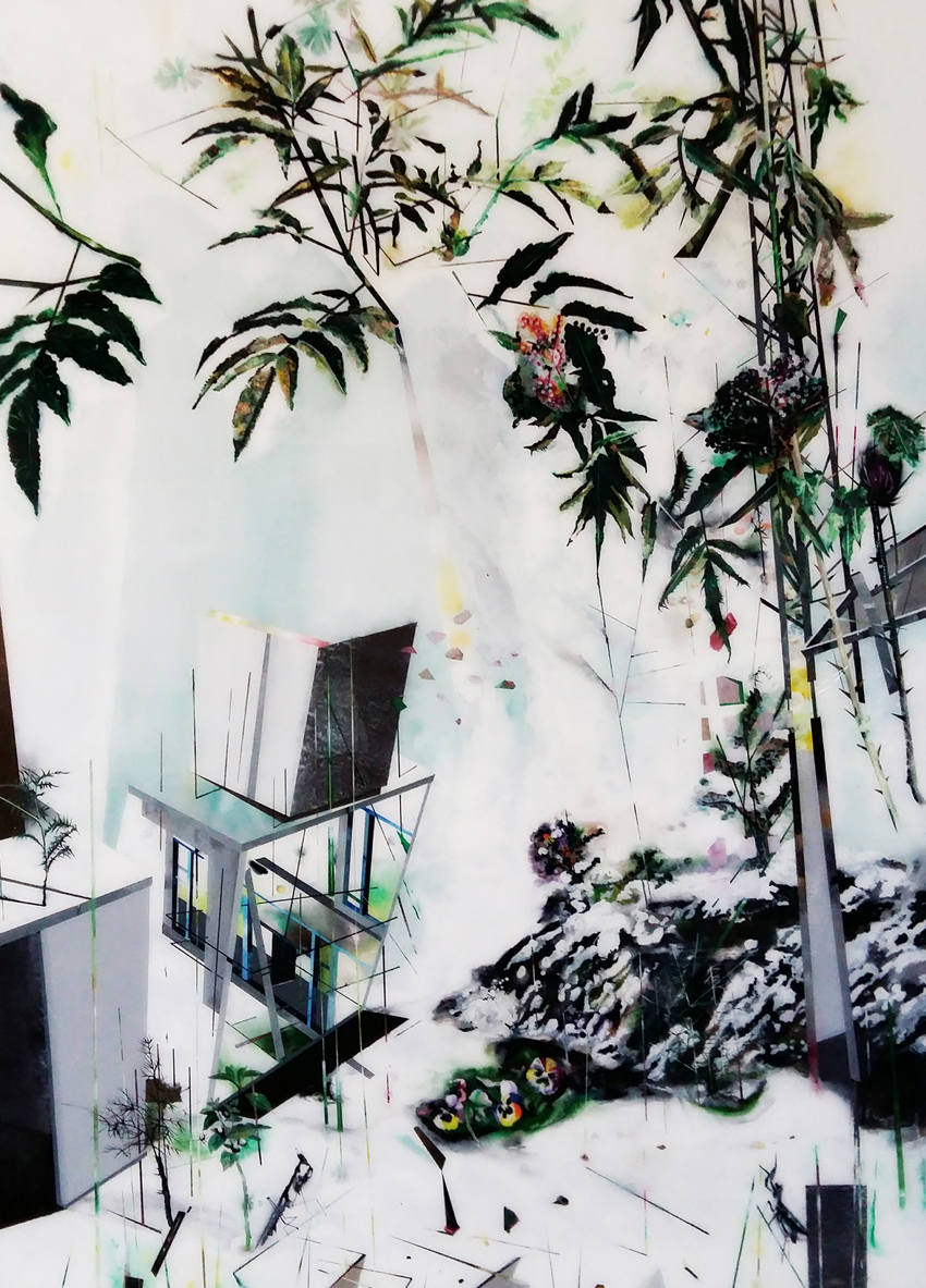I dipinti su plexiglas (in realtà, da dietro il plexiglas) di Muriel Rodolosse intendono mettere in discussione le opinioni comuni sulla natura. Nell'apparente qualità delicata e trasognata di molte sue opere, una caratteristica forse accentuata dallo sfondo bianco latte, è possibile percepire una lotta silenziosa tra elementi architettonici e naturali. L'idea di una natura disturbata viene messa in discussione attraverso il chiaro senso di natura selvaggia che predomina sulla superficie pittorica.