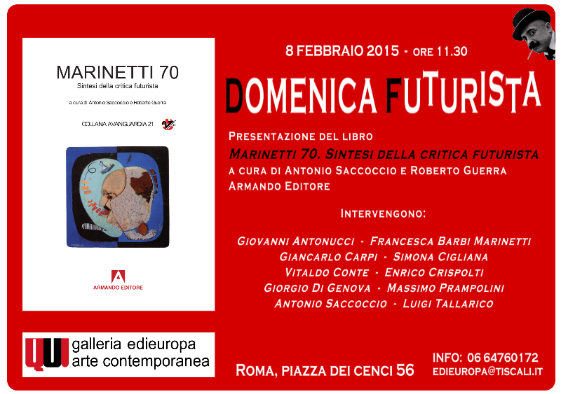 Domenica 8 febbraio 2015, alle ore 11,30, si terrà presso la Galleria Edieuorpa QUI arte contemporanea di Piazza Cenci 56, la presentazione del libro”Marinetti 70. Sintesi della Critica Futurista, a cura di Antonio Saccoccio e Roberto Guerra, Armando Editore.