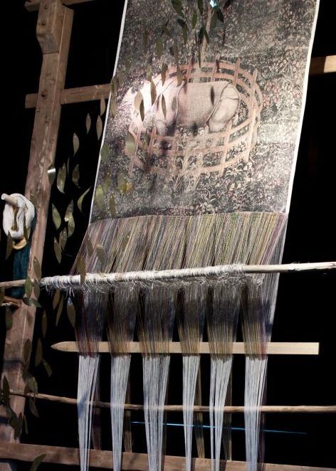 La simbologia di questa installazione si compone di diversi elementi che creano un effetto di sospensione: i fili, tirati sul telaio, sono in una fase di lavorazione ancora incompiuta e le forme geometriche dorate poste sul fondo controbilanciano il peso del filato. Tutto però è in bilico, in una situazione precaria che oscilla tra l’insita forza che la natura ha di ordire le trame della vita e l’arroganza propria di certi atteggiamenti contemporanei che invece tendono a contrastarla. Infine, le foglie di melograno – simbolo per eccellenza di prosperità – dalla pianta riprodotta sull’arazzo vengono realizzate in resina dall’artista, invadendo tutto l’ambiente circostante e inducendo lo spettatore a riflettere su come sarebbe il mondo se la natura dovesse perdere la sua spontanea fertilità.