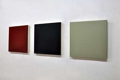 Le opere su tela, tutte di forma quadrata, sono caratterizzate da una straordinaria concentrazione cromatica capace di sommuovere l’attenzione, operando contemporaneamente in modo autoriflessivo su versanti che coinvolgono razionalità e sensibilità, coniugando un distaccato e impersonale agire della pittura con il realizzarsi di una sua possibile intensità poetica.
