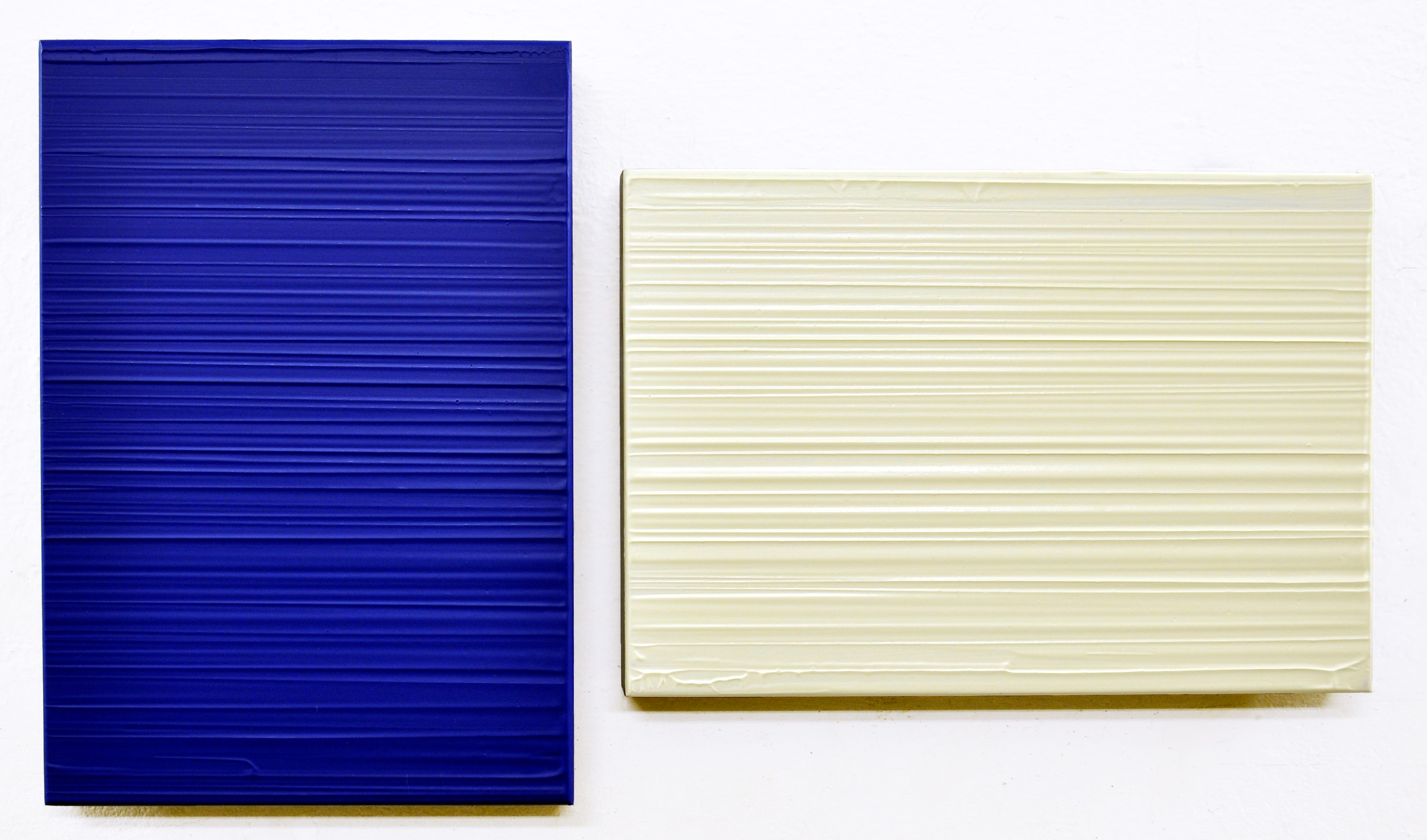 La concretezza di queste opere e la presenza sono il risultato di un perfetto equilibrio tra pittura stesa in materiche modulazioni e in armonico contrasto con la levigata consistenza dello spessore del supporto, il cui volume definisce la superficie dell’opera, spazio ove il lento mutare della luce e le vibrazioni delle scansioni lineari suggeriscono lo scorrere del tempo.