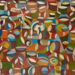 Una poetica in costante equilibrio tra realismo e astrazione, che si protrarrà sino agli Anni ‘80, quando l’artista inizierà un nuovo ciclo più giocoso, ironico, concettuale, basato sull’iterazione di oggetti d’uso comune (bulloni, libri, scatole, monete, sigarette, coni gelati, funghi, rottami) a rappresentare un genere umano variopinto, formato da individui solo apparentemente uguali, in realtà diversificati da accostamenti cromatici mai ripetitivi.