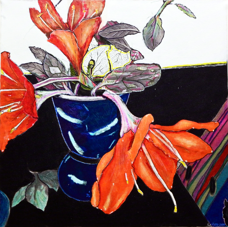 Le opere in mostra sono quadri fotografici, scatti realizzati en-plein-air e poi dipinti su tela in studio, di fiori di campo, tralci di bouganville o alberi di Filicuso che circondano la campagna di Curinga, in Calabria, città natale dell’artista.