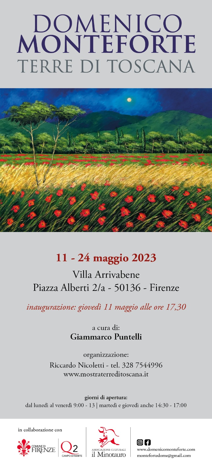 “Terre di Toscana” è un progetto espositivo itinerante, dove i paesaggi toscani dipinti con la sensibilità e la creatività di Domenico Monteforte arrivano al cuore del visitatore regalando forti emozioni. Sono esposti dipinti su tela e su carta.
