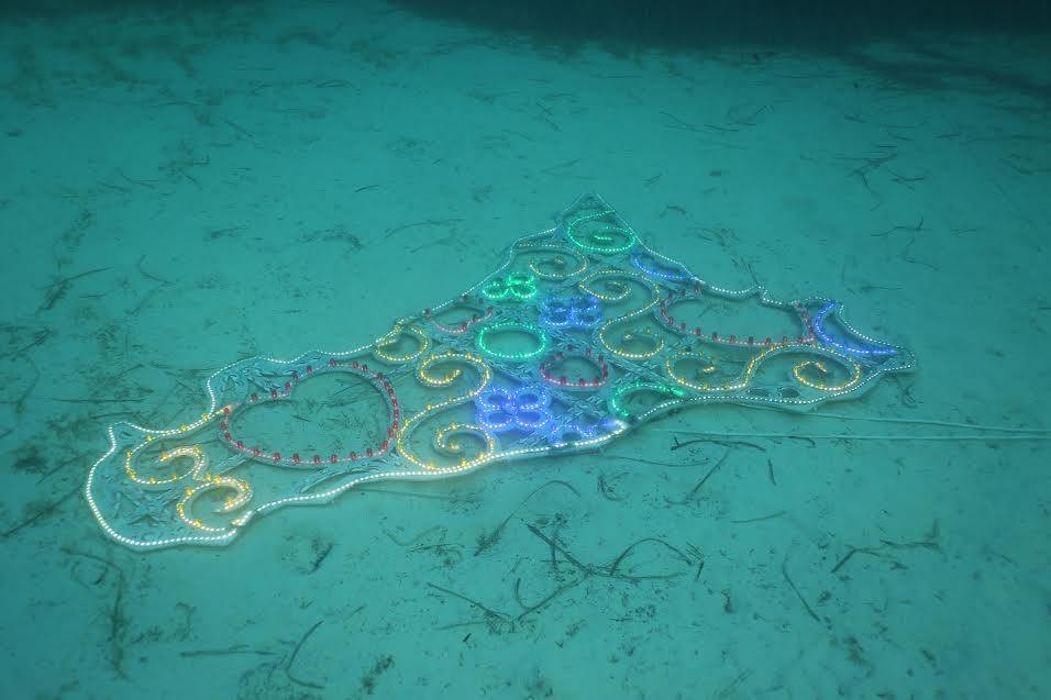 L’installazione luminosa di Domenico Pellegrino, ricca di decori barocchi inseriti in una figura che richiama la Sicilia, è nata come struttura acquatica immaginata dall’artista per raccontare una vera e propria “visione sottosopra” del Mediterraneo