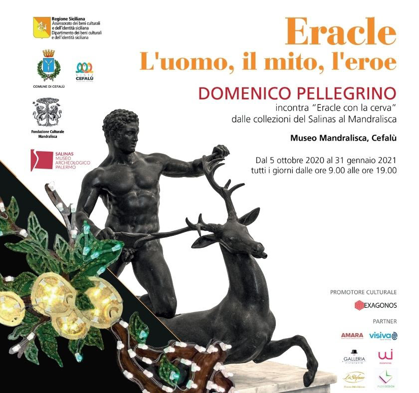 Oggi, l’ispirazione da cui Pellegrino prende le mosse per la sua personale riflessione sull’archetipo classico dell’eroe è la scultura di Eracle con la cerva di Cerinea, il finissimo gruppo bronzeo rinvenuto durante gli scavi archeologici di Pompei, donato alla città di Palermo da Ferdinando IV, e da allora custodito al Museo Regionale A. Salinas, dov’è uno dei reperti più famosi e ammirati. Per l’occasione, grazie alla collaborazione tra l’ente museale siciliano e il prestigioso Museo Archeologico Regionale A. Salinas, prestatore- per la prima volta nella storia del Museo- della celebre scultura, il bronzo pompeiano dialoga con le opere diffuse di Domenico Pellegrino, così come anche gli altri reperti che appartengono alle collezioni del Museo di Cefalù, esaltando, per contrasto, la relazione che si istituisce tra storia e contemporaneità.
